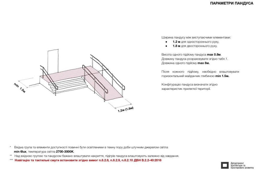 Окремо пропрацювали вимоги до габаритів, ухилів і ширини між поручнями пандуса. Наприклад, всі елементи мають бути заокруглені, щоб людина не травмувалася під час пересування. Покриття необхідно робити безшовним і монолітним, щоб уникати вібрації. Якщо пандус має металеве покриття – слід враховувати мінімальну ширину отворів, щоб туди не потрапляли різні елементи навігації у людей з вадами зору.