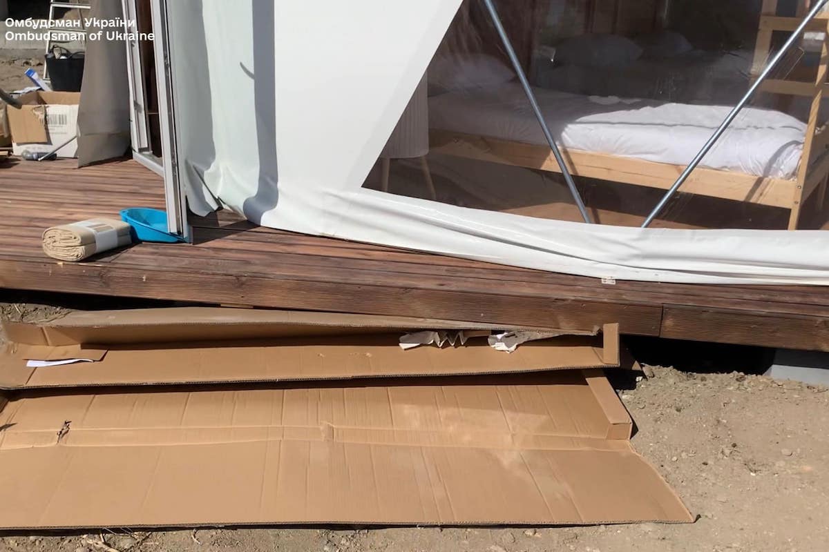 Як виявилося, табір не готовий до проживання. На території досі тривають будівельні роботи. Глемпінги — поліетиленові намети без кондиціонування, в яких розмістили двоярусні ліжка. Всередині намети нагрівалися до 40 градусів.