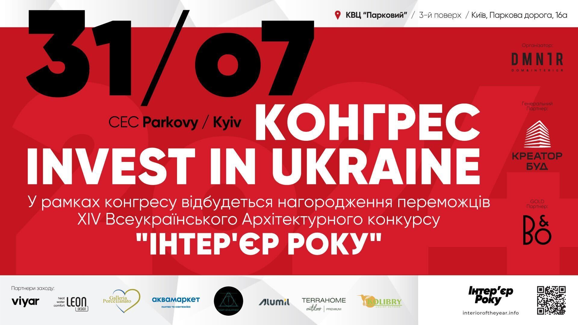 31 липня у КВЦ «Парковий» в Києві пройде конгрес INVEST IN UKRAINE, на якому нагородять переможців XIV-го Всеукраїнського щорічного архітектурного конкурсу «Інтер’єр року».