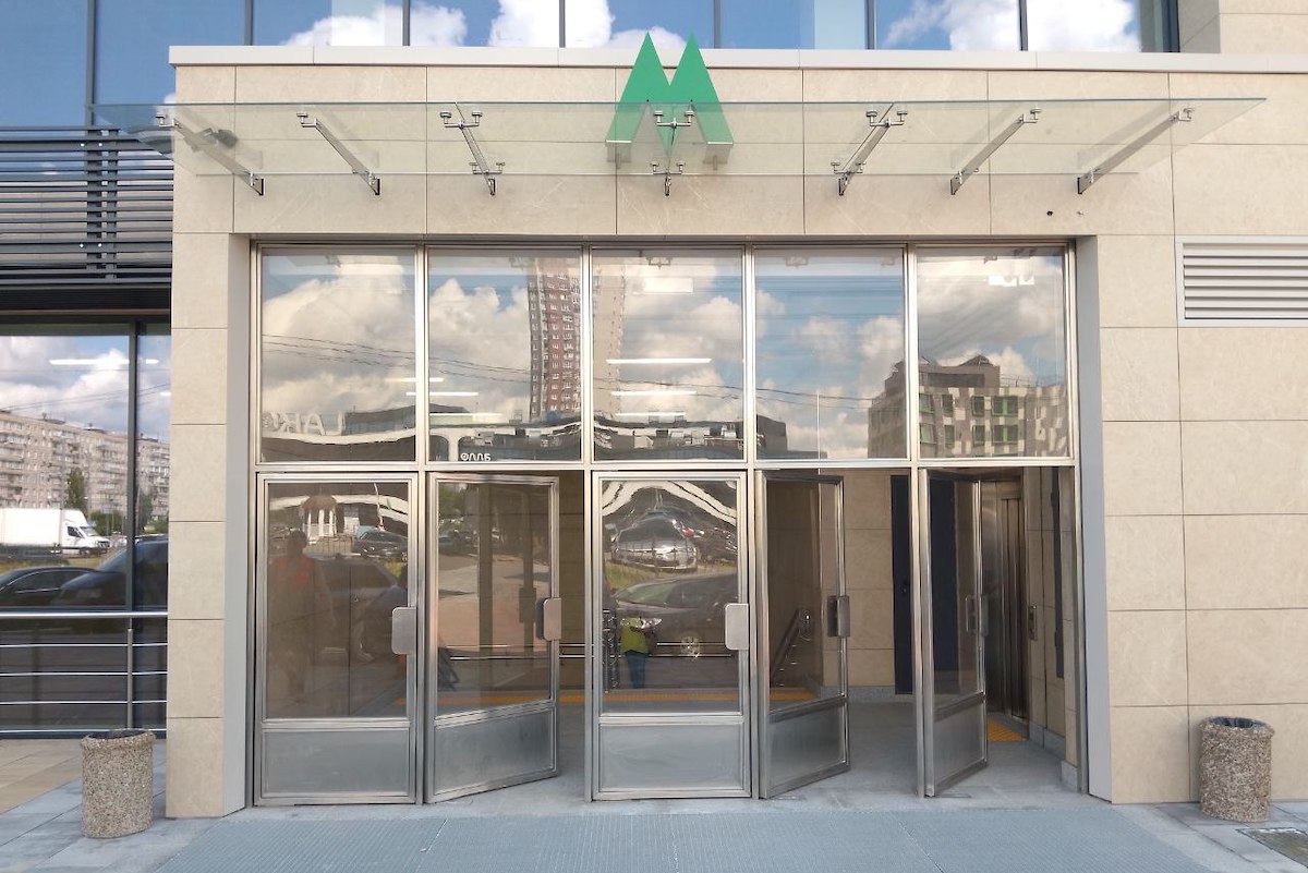 На прозорих полотнах вхідних дверей немає контрастного маркування, як це передбачено ДБН.