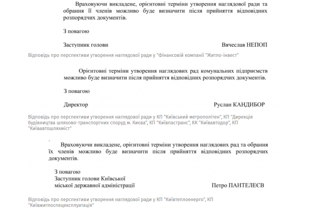 «У ситуації, коли в Києві все ще функціонує безліч КП, що управляють і розпоряджаються майном громади м. Києва, однак багато з них дотуються з київського бюджету, механізм незалежного контролю за їхньою діяльністю конче потрібний. Таким контролем могли б стати саме наглядові ради, якщо б їхні члени обирались на прозорому конкурсі».