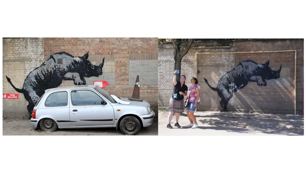 Зокрема, на малюнку носорога, який залізає на авто з дорожнім конусом на капоті, пізніше було помічено біле графіті. А минулого тижня вкрали супутникову антену з зображенням виючого вовка, яке стало четвертим у серії.