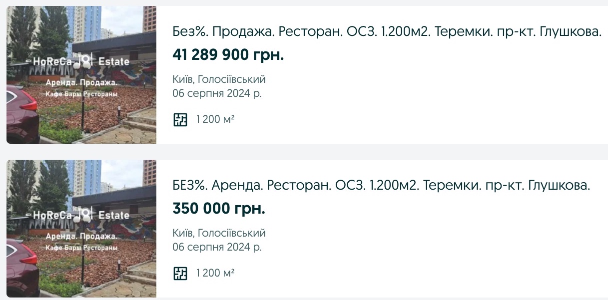 Одночасно агенція опублікувала й оголошення про можливу оренду ресторану за 350 тисяч гривень на місяць.