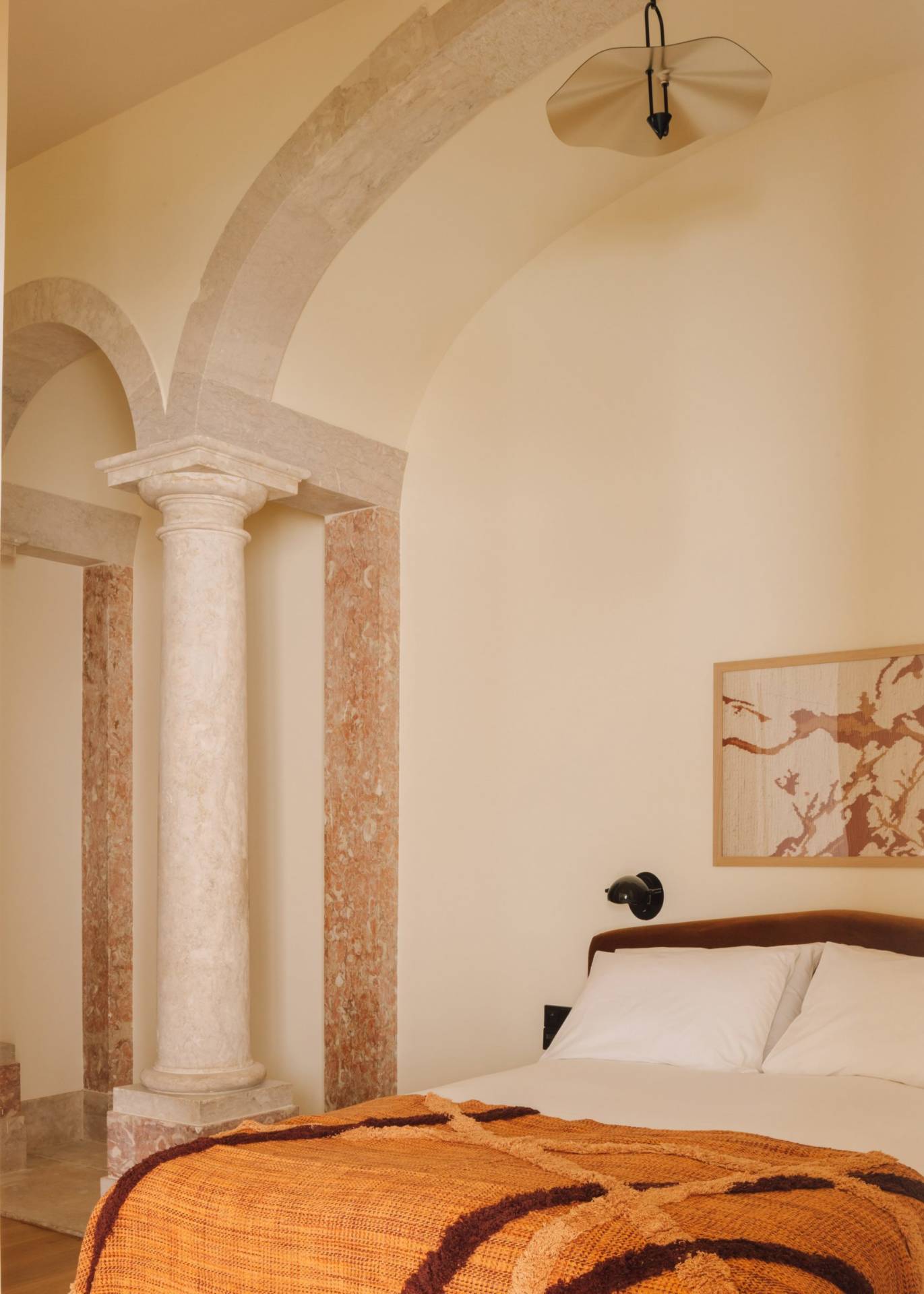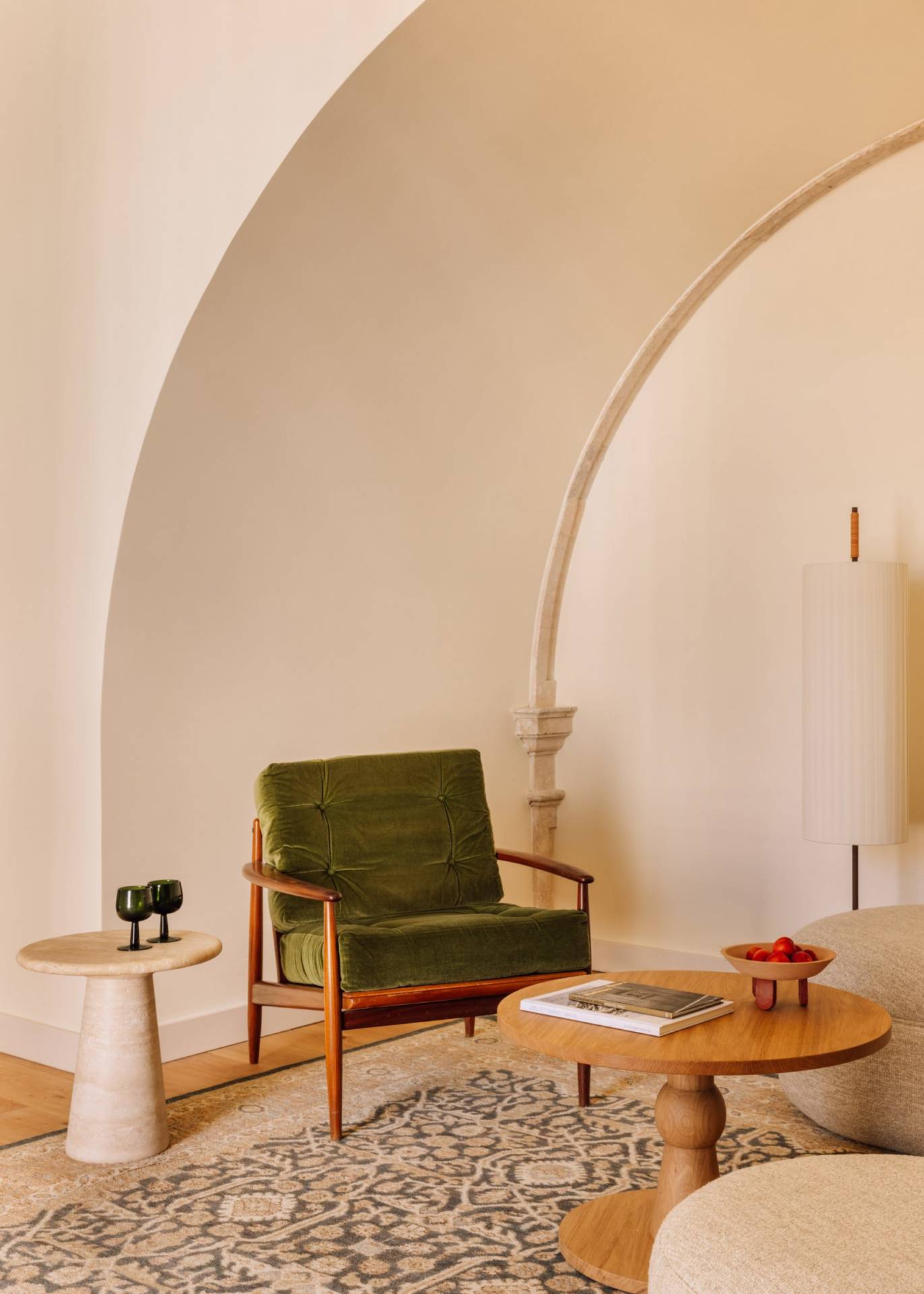 В інтер’єрах дизайнери зберегли та підкреслили автентичні архітектурні елементи, – арки, колони і ліпнину. Історичні деталі доповнили сучасними меблями, освітленням та іншим декором у природних кольорах.
