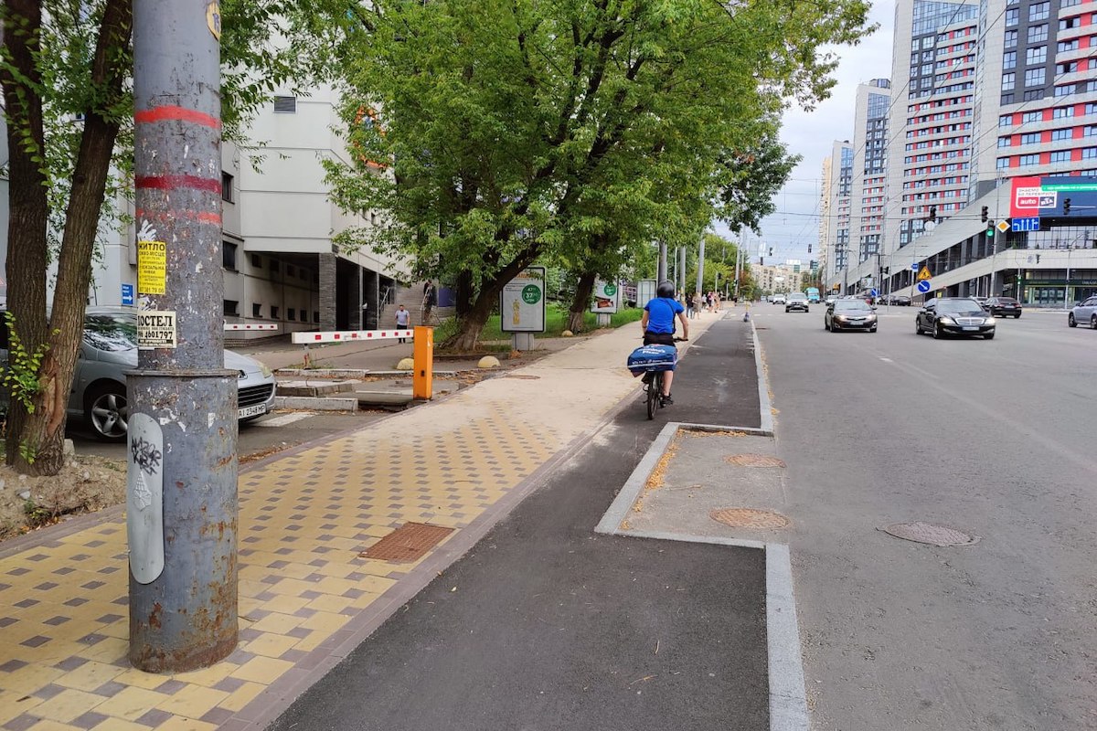 По обидва боки вулиці будують односторонні велодоріжки. В одному місці заїзд на прилеглу територію оформили у вигляді виїмки, обрамленої бордюром, залишивши велосипедистам лічені сантиметри.