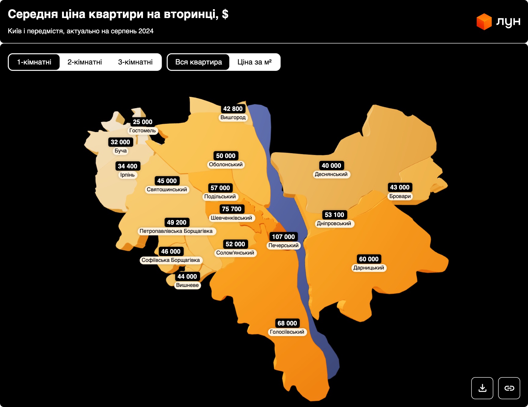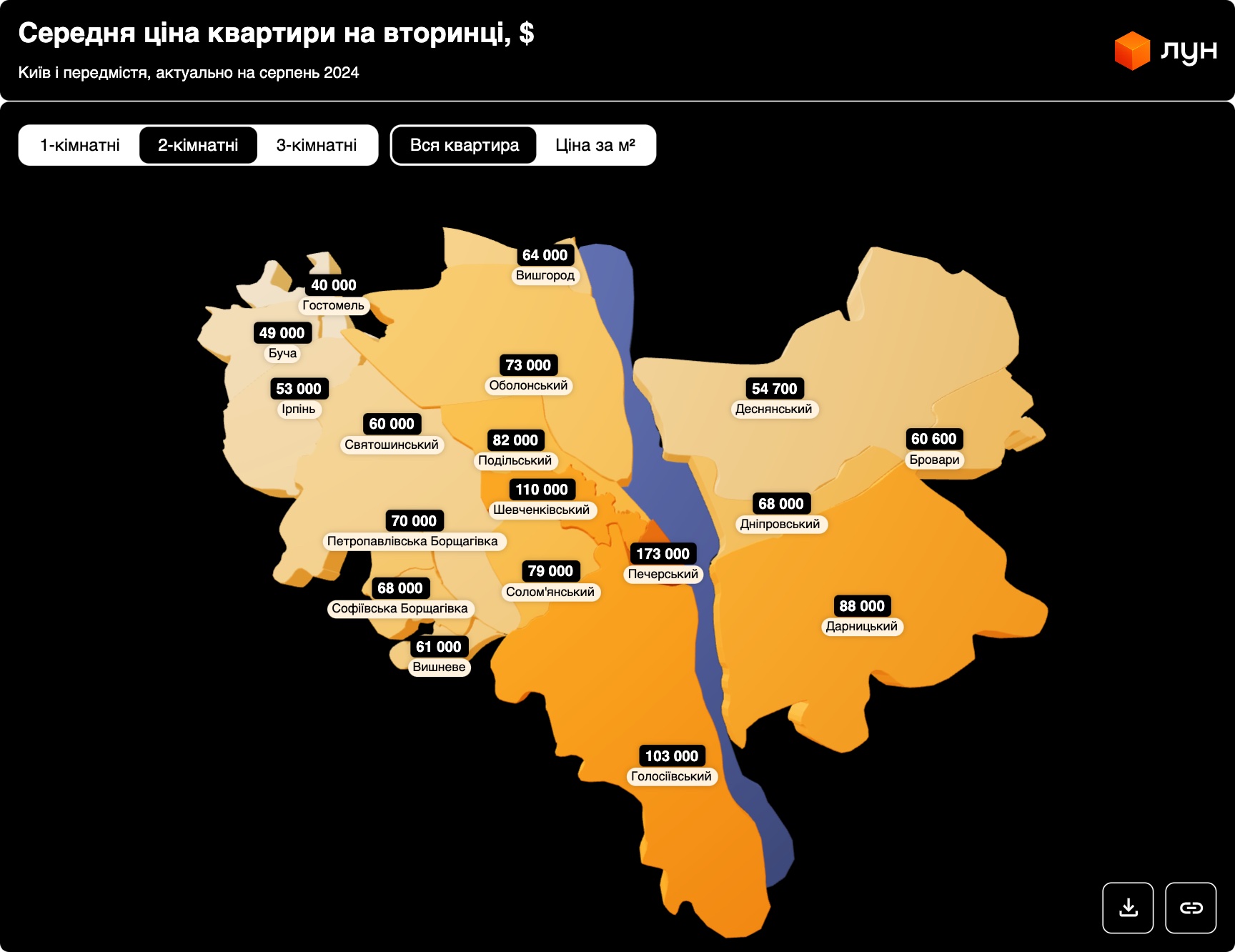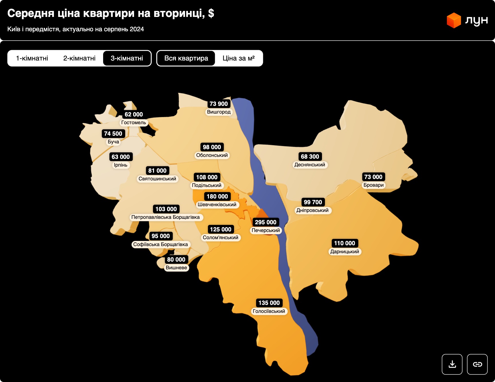 Найдорожчим районом столиці лишається Печерський, де медіанна вартість однокімнатної становить 107 тисяч доларів, двокімнатної — 173 тисячі, трикімнатної — 295 тисяч.