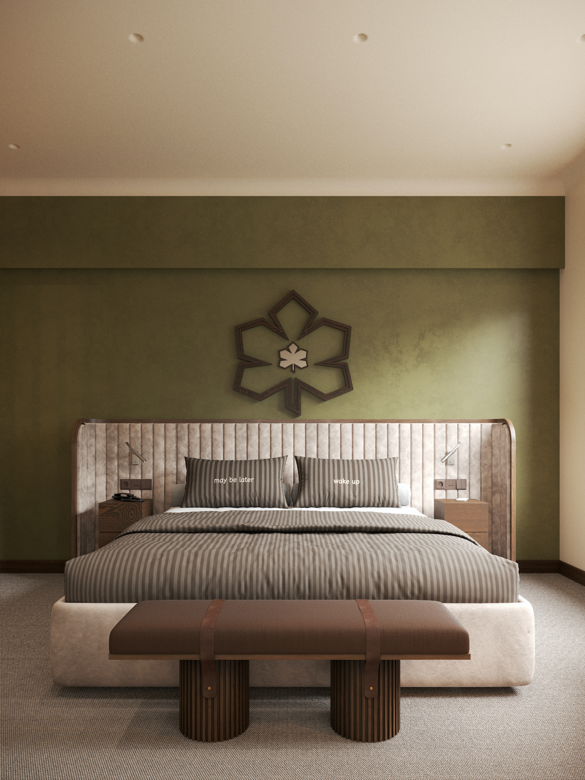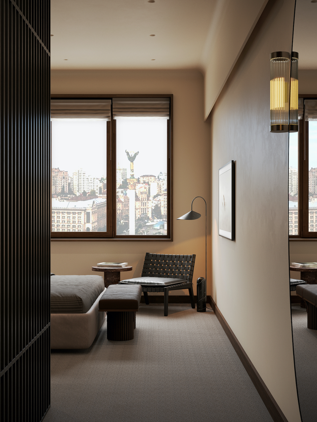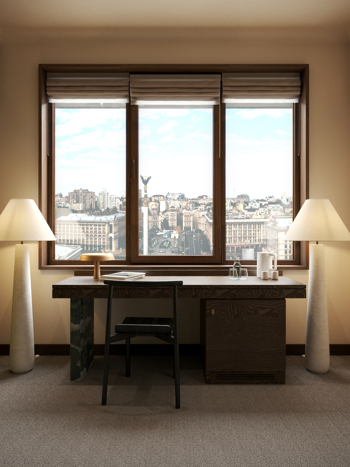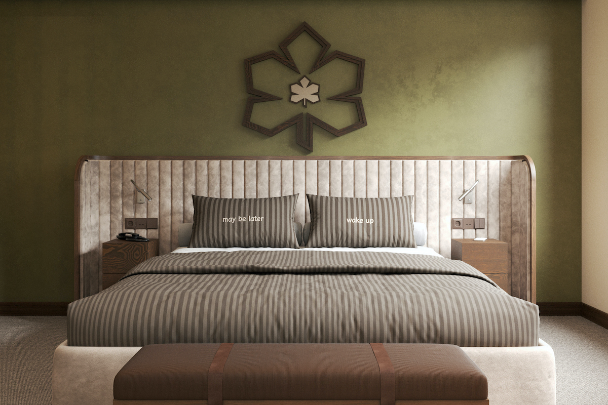 Візуалізації готельних номерів розробила студія TEMO hotel design. Ідею описують як «поєднання лагідної розкоші з найсучаснішими технологіями».