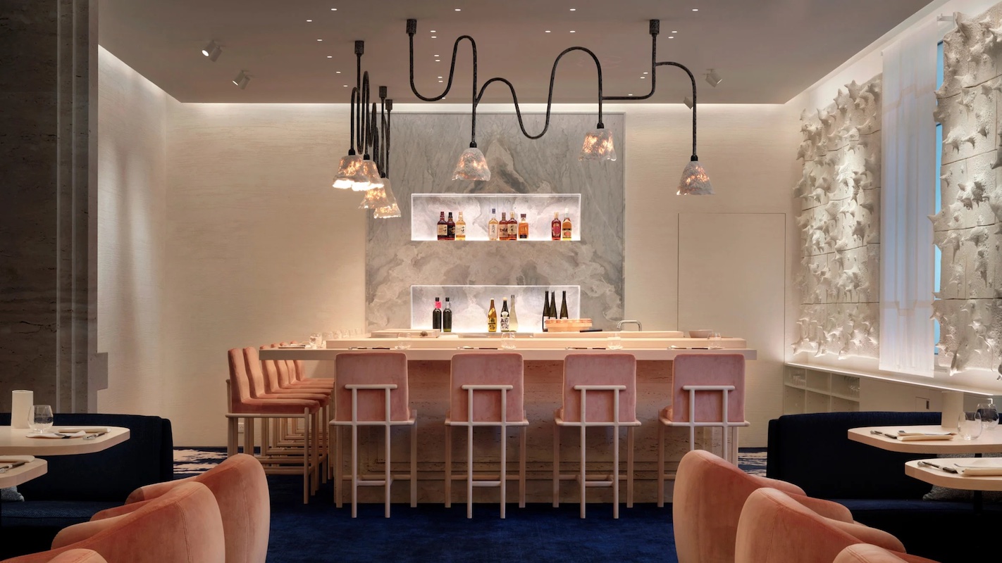 Простір прикрашено інсталяцією кераміста Вільяма Коґґіна «Коралова стіна»: білі об’ємні поверхні, що нагадують коралові рифи, піщані дюни або океанські хвилі. Саме від цієї художньої роботи і відштовхувалися далі у розробці проєкту інтер’єру.