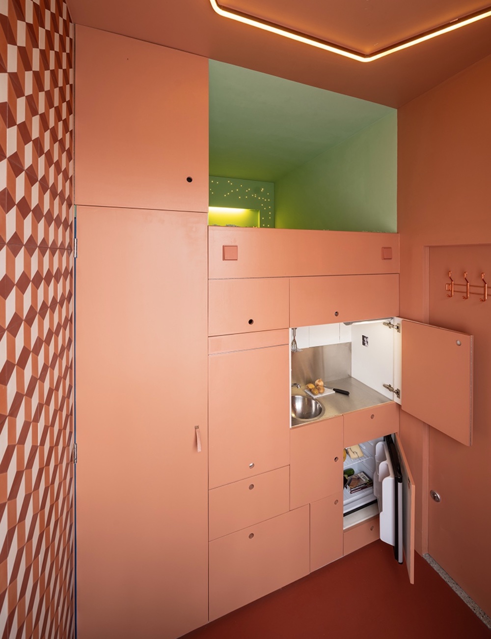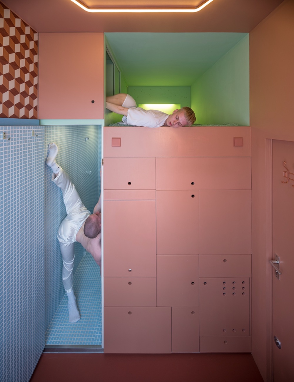Простір поділено на чотири зони, кожна з яких вирізняється матеріалами: основна «кімната» зі стелею заввишки три метри; спальне місце, де стеля починається вже на висоті 1,1 метра; туалет із душем; спа. Так, у такі тісній квартирі вдалося вмісти спа: приміщення з ванною, джакузі та сауною.
