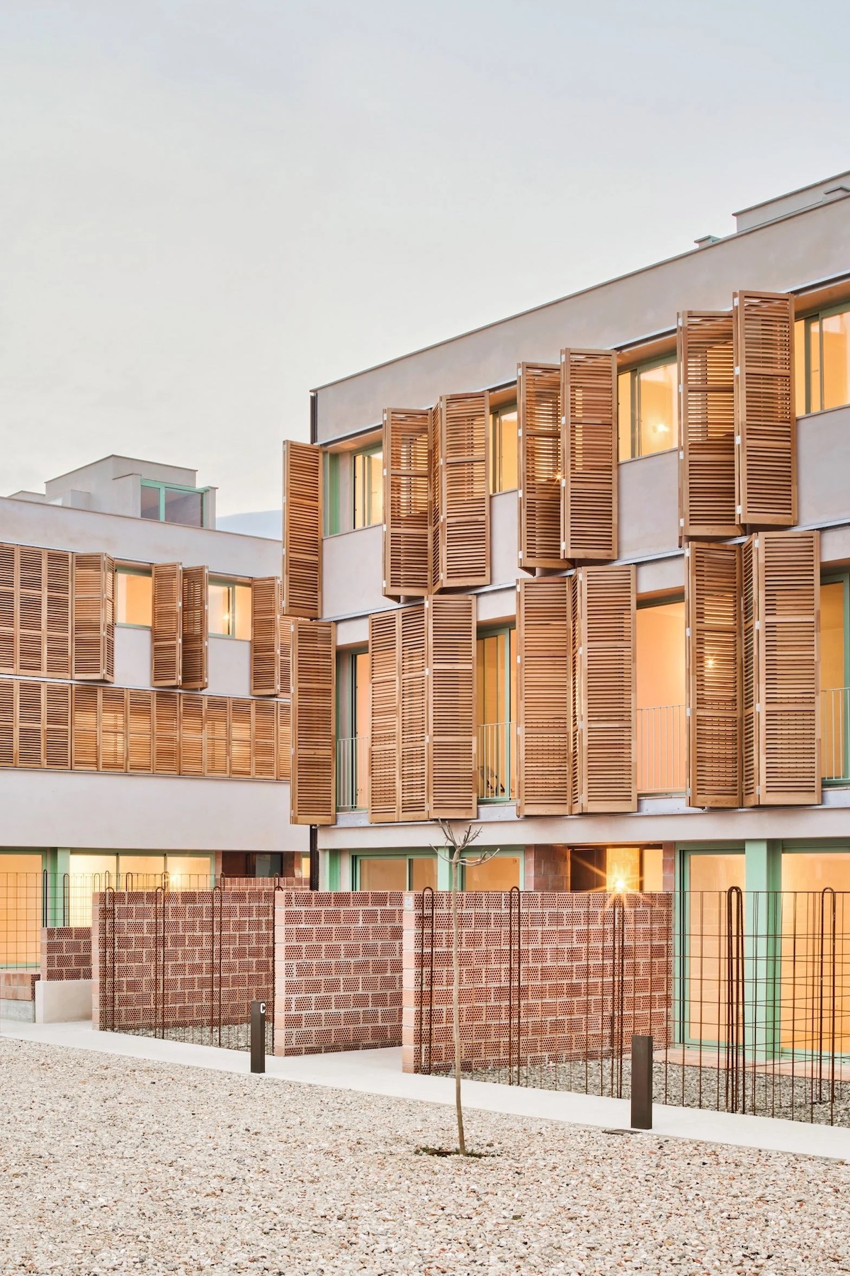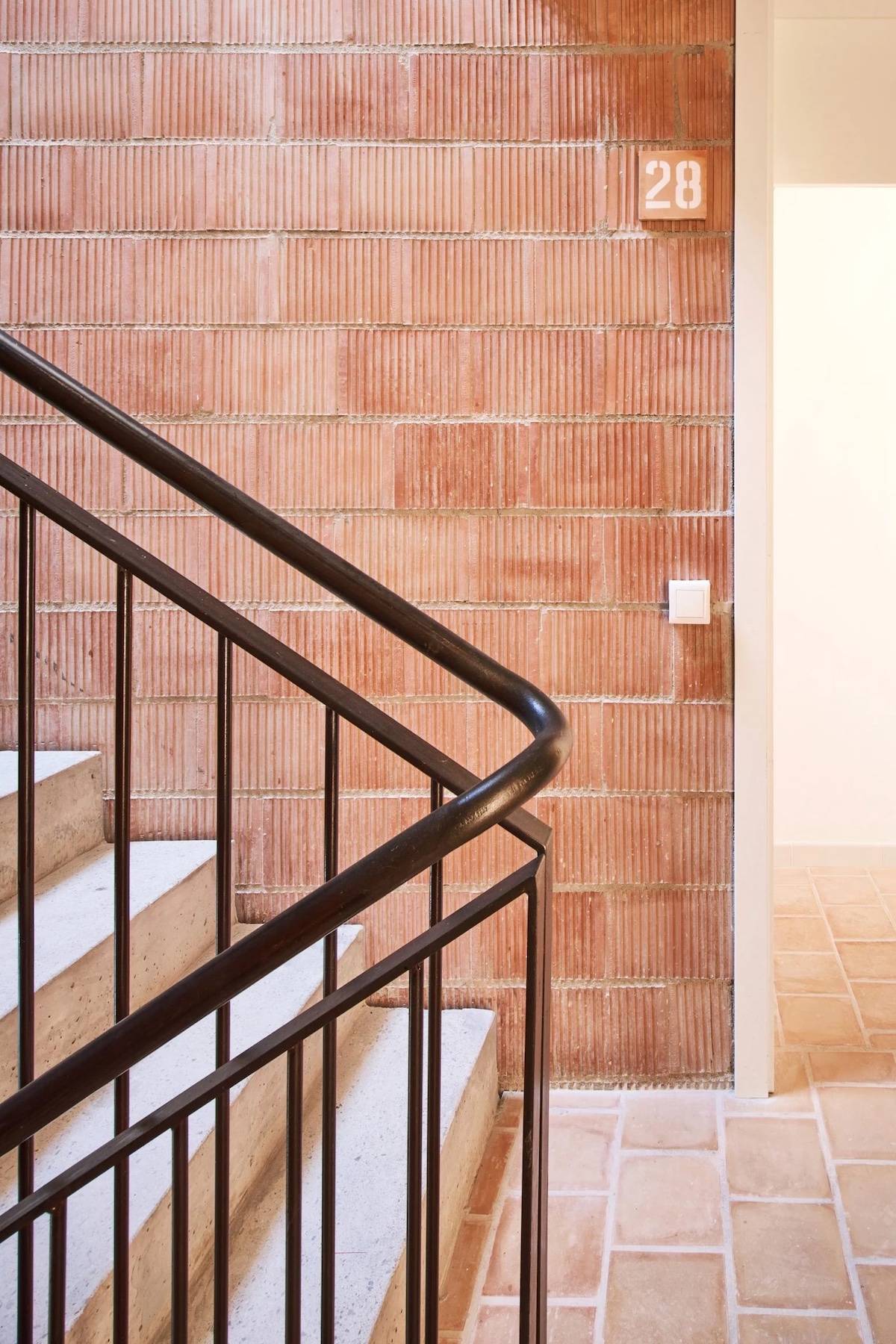 Квартири першого поверху відмежовані від вуличної метушні смугою саду, яка своєю чергою, відгороджена легкими металевими решітками та перфорованими керамоблоками. Вони, як і керамічна плитка на фасаді, виготовлені з місцевої глини. Кераміка поліпшує так звану термальну масу будівлі — вирівнювання коливань добової температури.