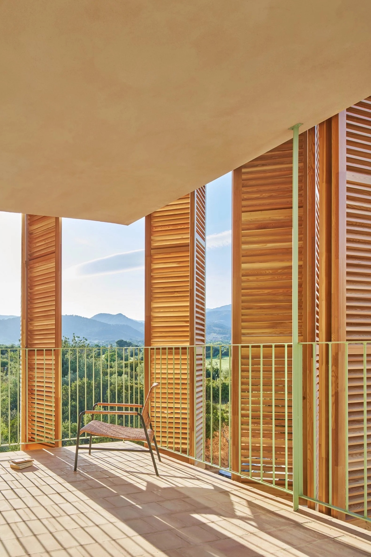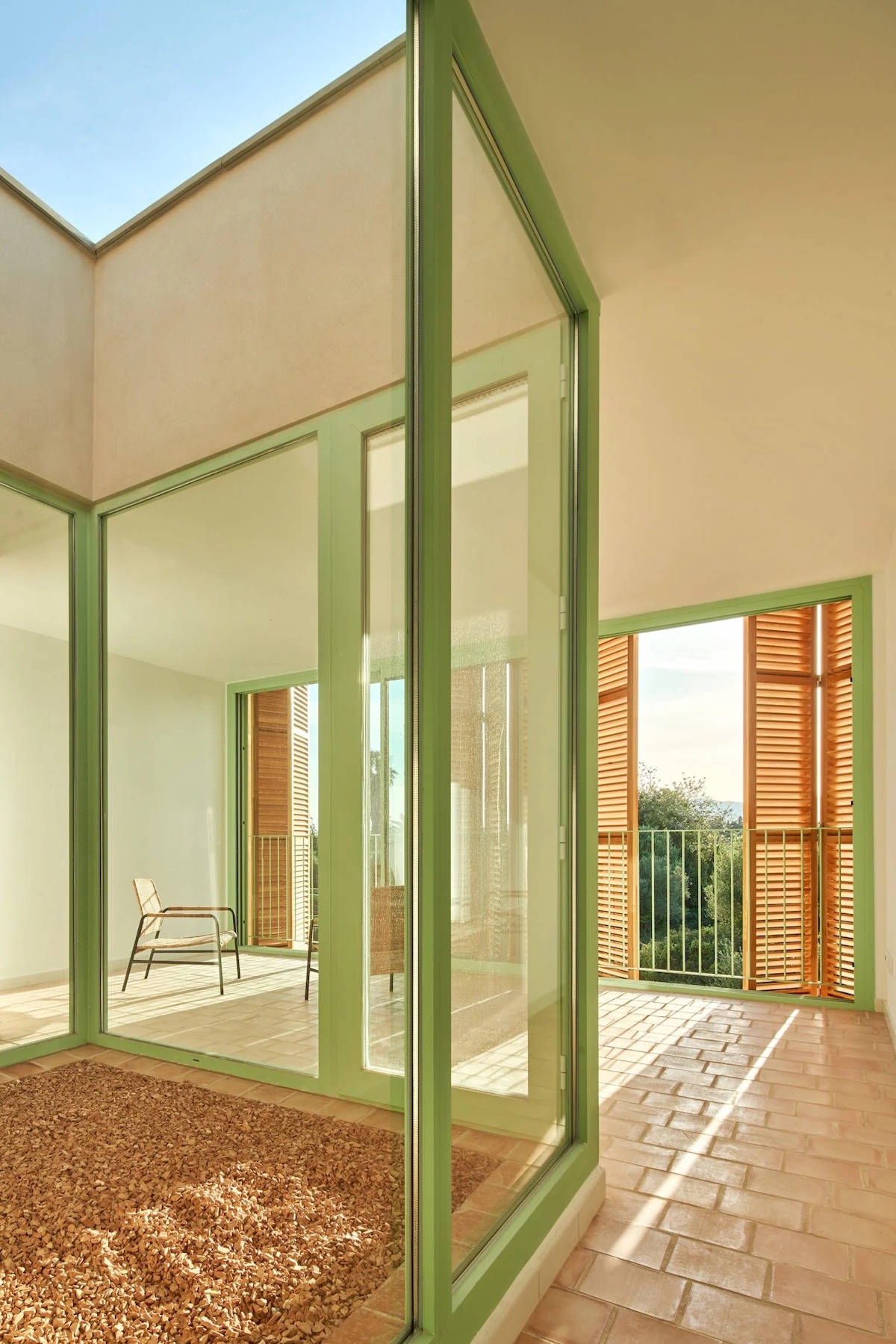 Фасадні отвори — вікна та тераси — закривають віконниці, виготовлені з місцевої модрини. Вони забезпечують наскрізну вентиляцію будівлі, а також є ефективним захистом від сонця. Це традиційний елемент середземноморської архітектури — зовнішні жалюзі, віконниці чи маркізи незамінні у спекотному кліматі, особливо вологому.