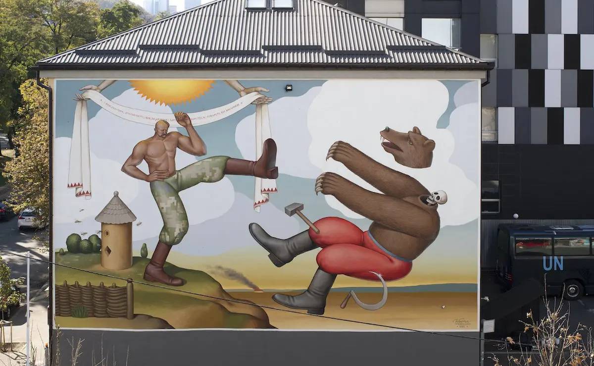 На вулиці Нижній Вал на київському Подолі відкрили мурал, створений художником Володимиром Манжосом (WaOne Interesni Kazki) для Головного управління розвідки.