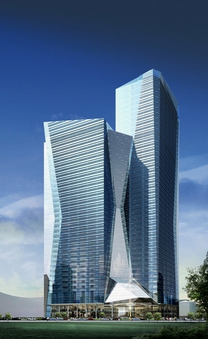 За проєктом, Sky Towers складається з двох прямокутних веж, поєднаних стилобатом, та прибудованої споруди банку. Одна вежа — 47 поверхів, або 214 метрів, інша —34 поверхи.