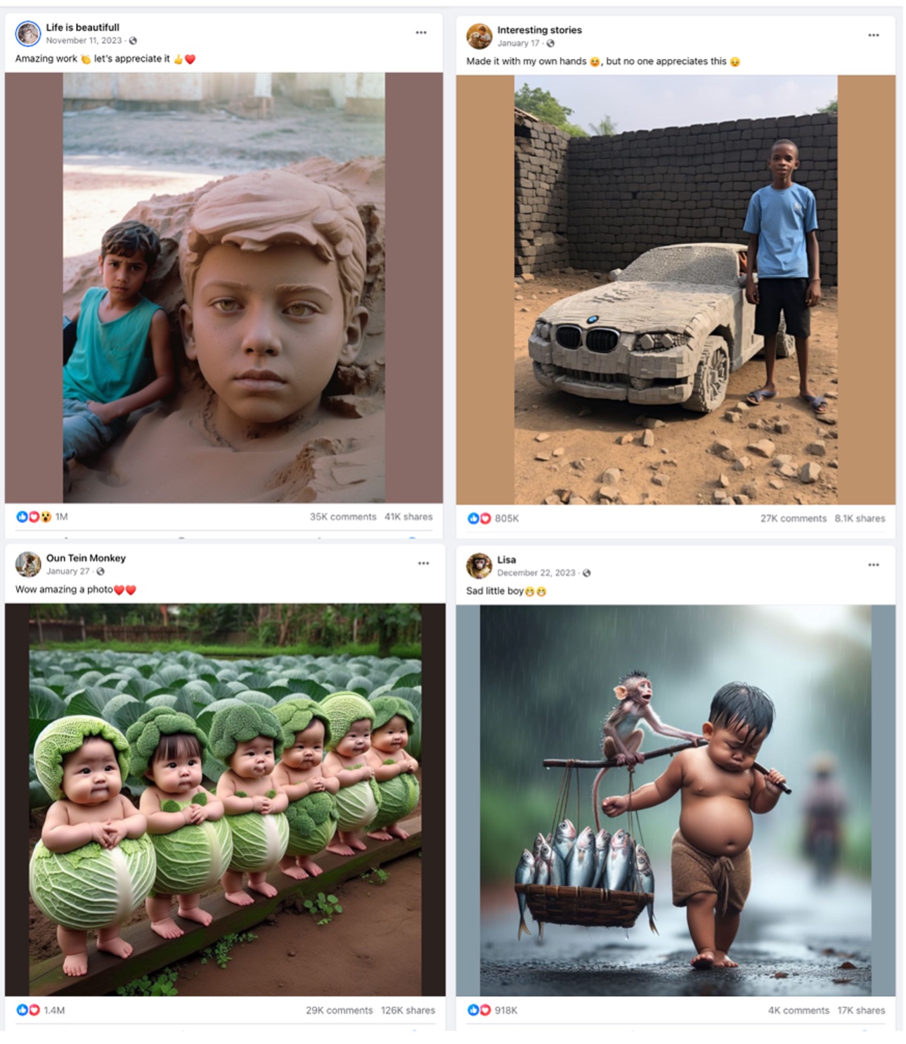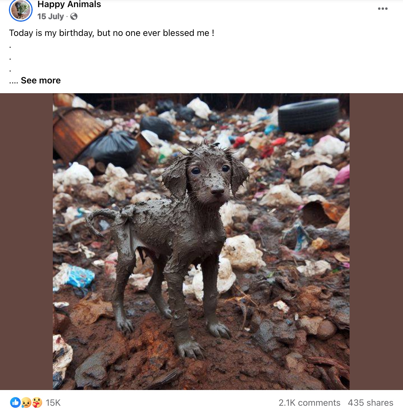 Спамери та шахраї часто вдаються до подібних тактик. ШІ-зображення нерідко супроводжуються коментарем, спрямований на емоційну реакцію: наприклад, літніх людей, людей з інвалідністю, дітей, тварин із написом «Сьогодні мій день народження, я (дуже хворий / потворний), і мене ніколи ніхто не вітав».