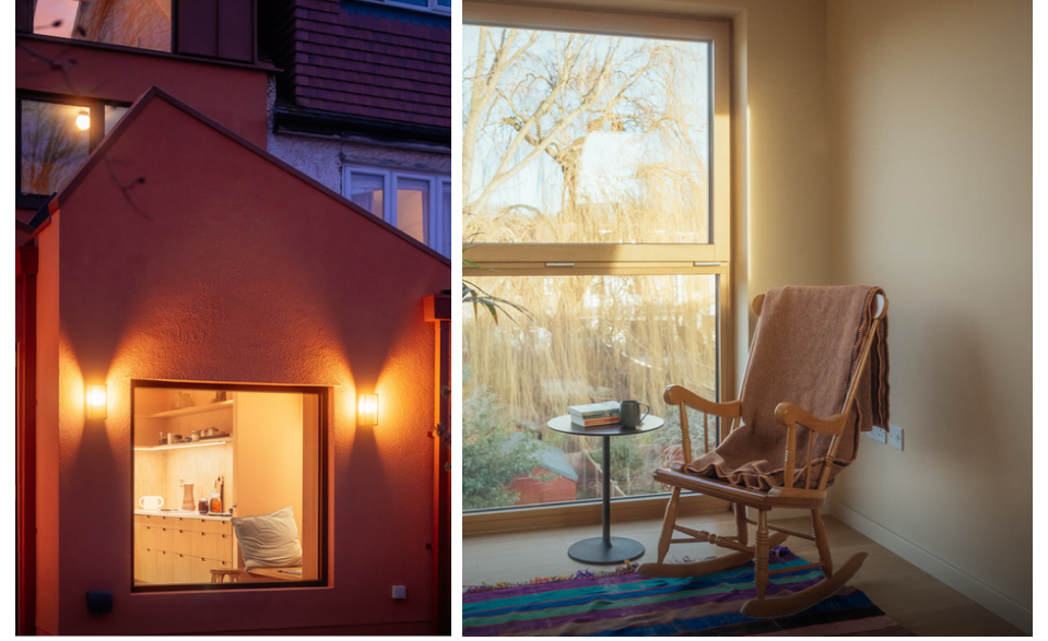 До будинку було додано 60 м², включаючи перебудовану на першому поверсі кімнату та мансарду, що створило сучасний дизайн із великими вікнами та механічними люками для природного освітлення.