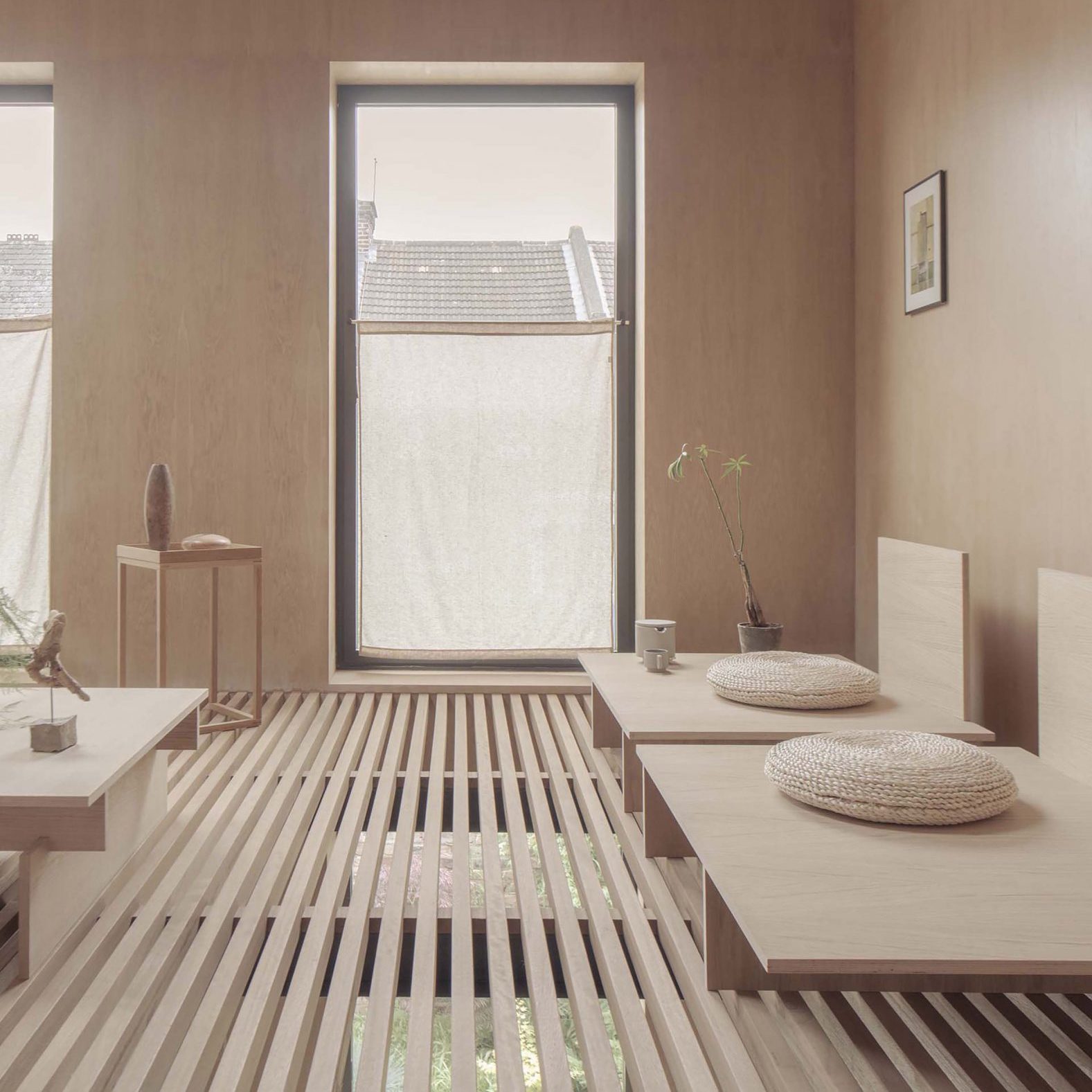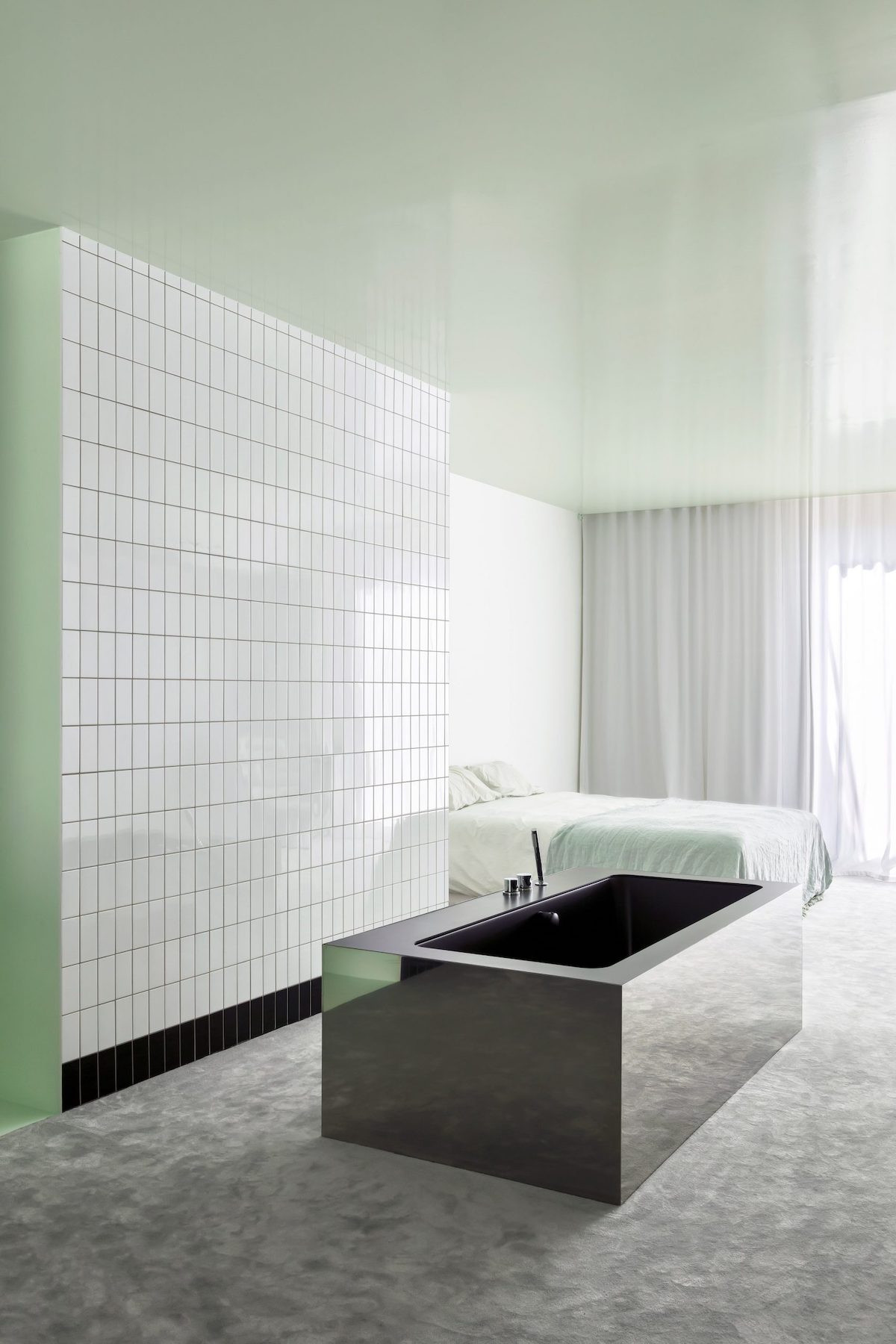 Інтер’єр квартири в бельгійському Антверпені розробляли Atelier Dialect. Ванна у центрі спальні викликає деякі питання, особливо те, що вона стоїть на килимі.