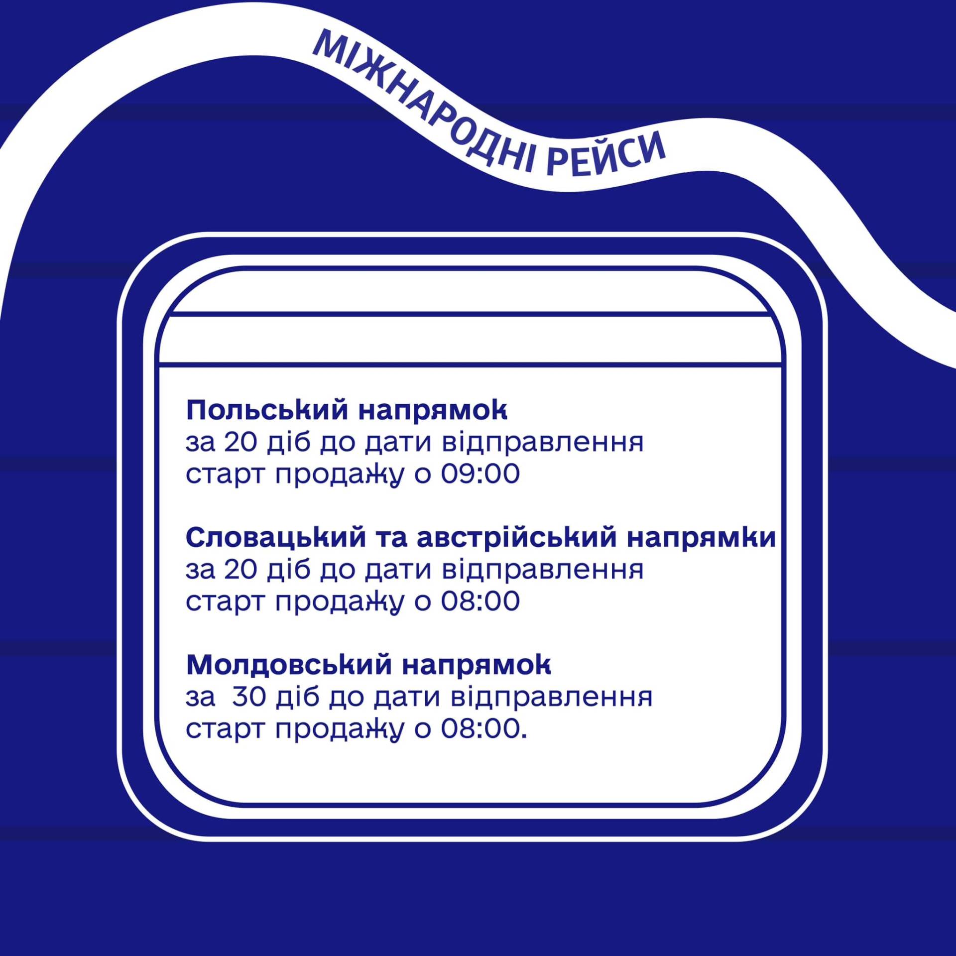 Міжнародні напрямки. Квитки на польський напрямок (до Перемишля, Хелма і Варшави) починають продавати о 9:00 за 20 діб до дати відправлення. До Словаччини та Австрії — о 8:00 за 20 діб. До Молдови — о 8:00 за 30 діб.
