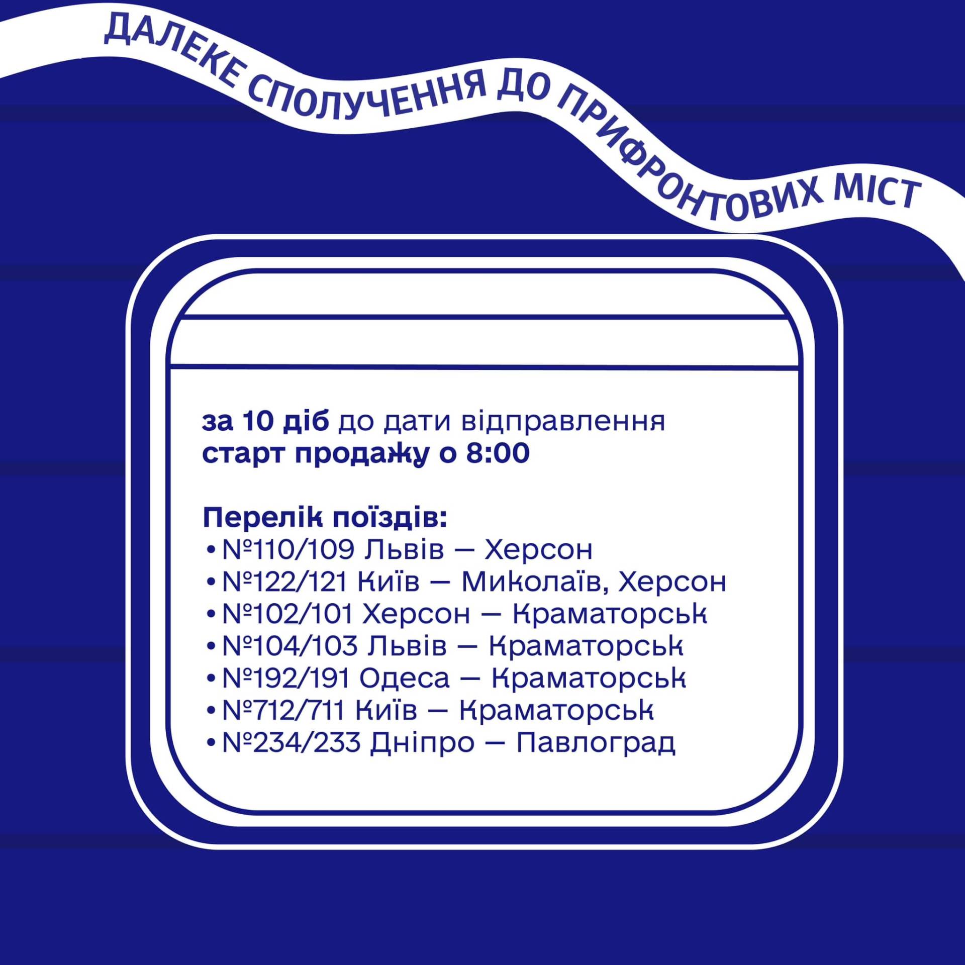 Глибина продажу за 10 діб також поширюється на групи безпересадкових вагонів №086-234/233-085, №080-234/233-079 Львів–Павлоград, Київ–Павлоград, а також на регіональні поїзди 800-ї нумерації та регіональний експрес № 702/701 Львів–Чернівці.