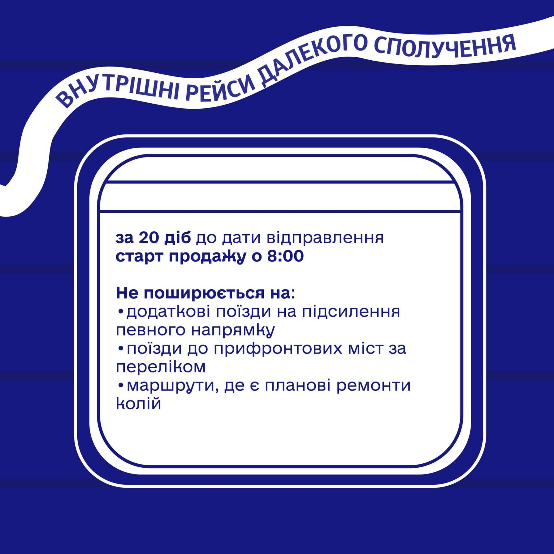Загалом продаж квитків на внутрішні рейси далекого сполучення стартує за 20 діб до дати відправлення.