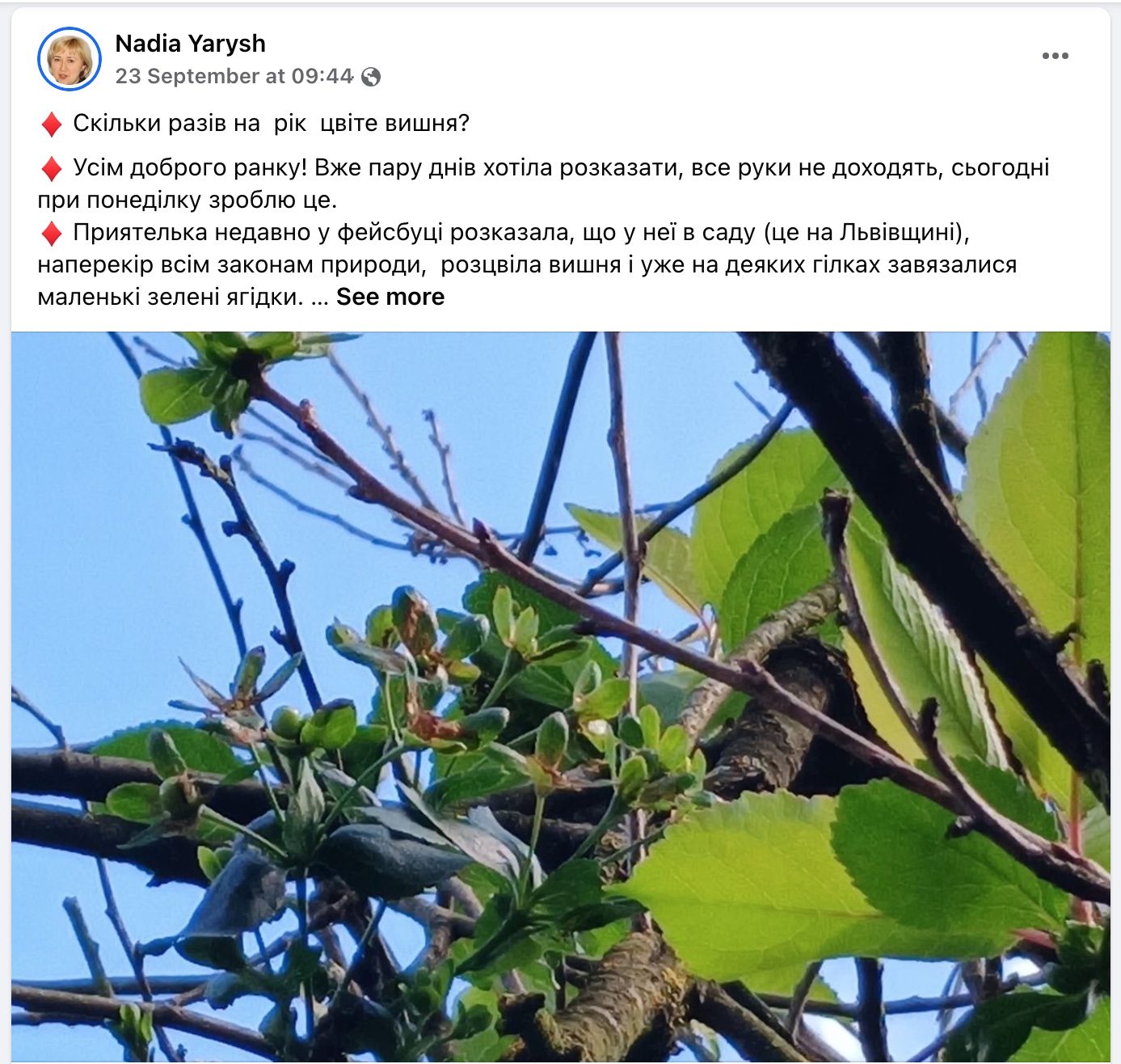 У вересні та жовтні в Україні триває аномальне цвітіння плодових дерев: груш, яблунь, вишень, слив. Також вдруге розквітли каштани.