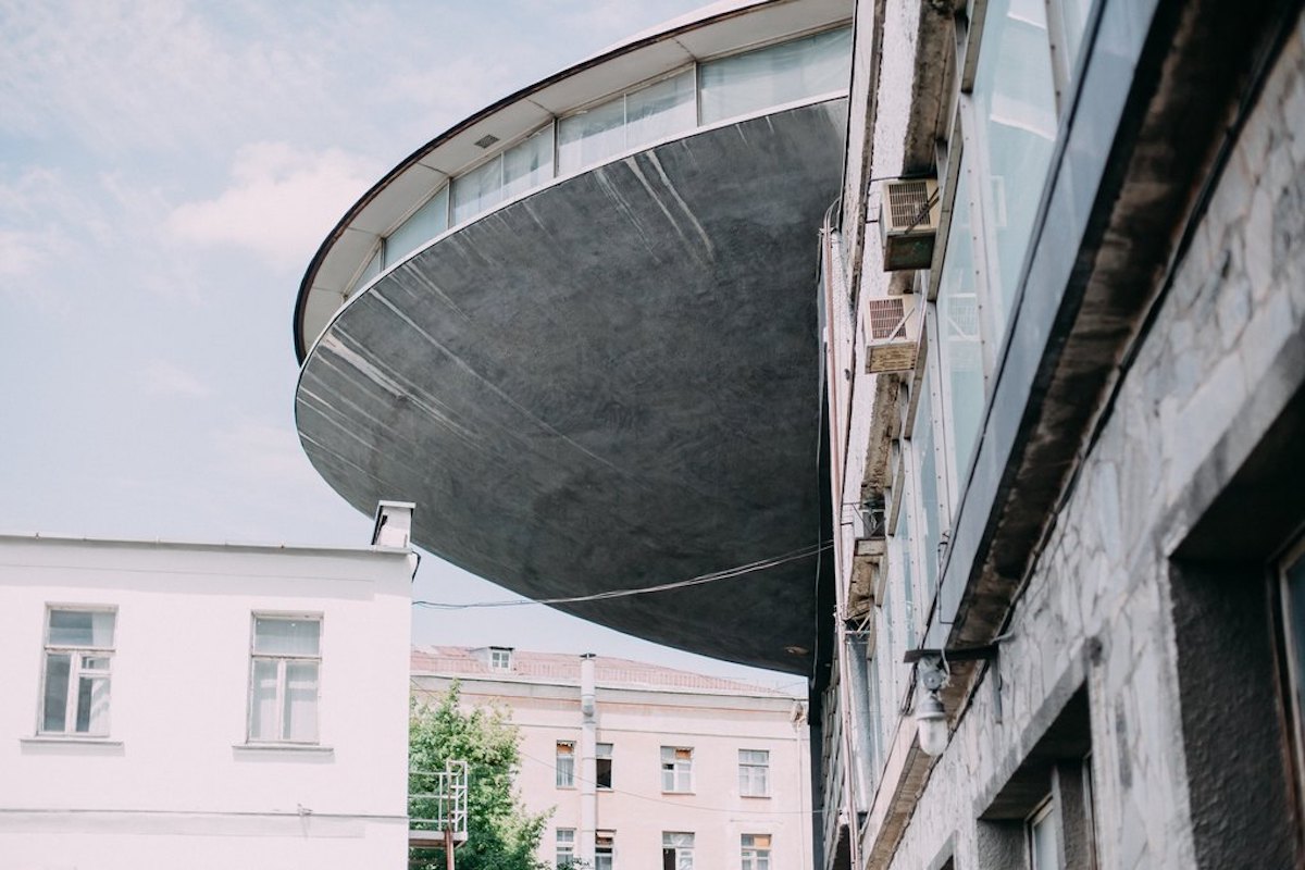 Будівлю Інституту науково-технічної експертизи та інформації з концертною залою у вигляді «літаючої тарілки» було збудовано 1971 року за проєктом архітекторів Флоріана Юр’єва і Льва Новикова.