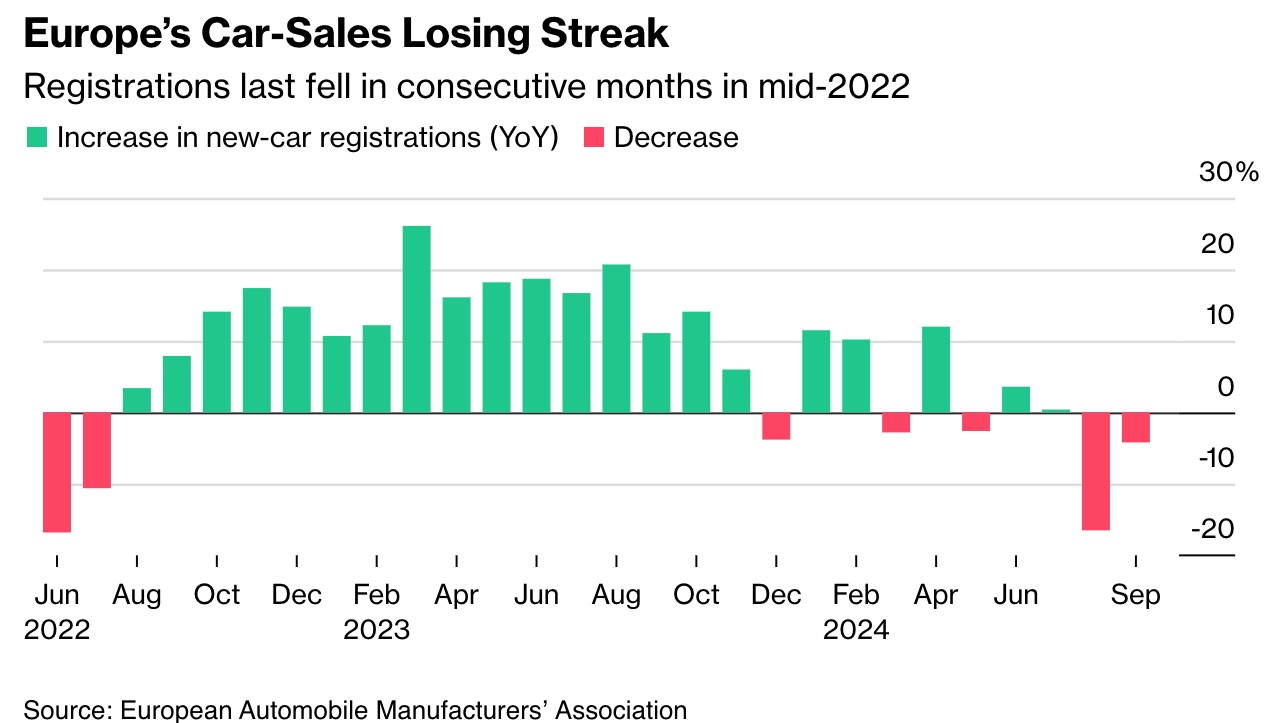 Продажі автомобілів у Європі впали вперше за два роки на тлі стагнації економіки регіону. У вересні зареєстрували на 4,2% менше нових автомобілів порівняно з минулим роком — 1,12 мільйона штук, повідомляє Bloomberg із посиланням на Європейську асоціацію автовиробників.