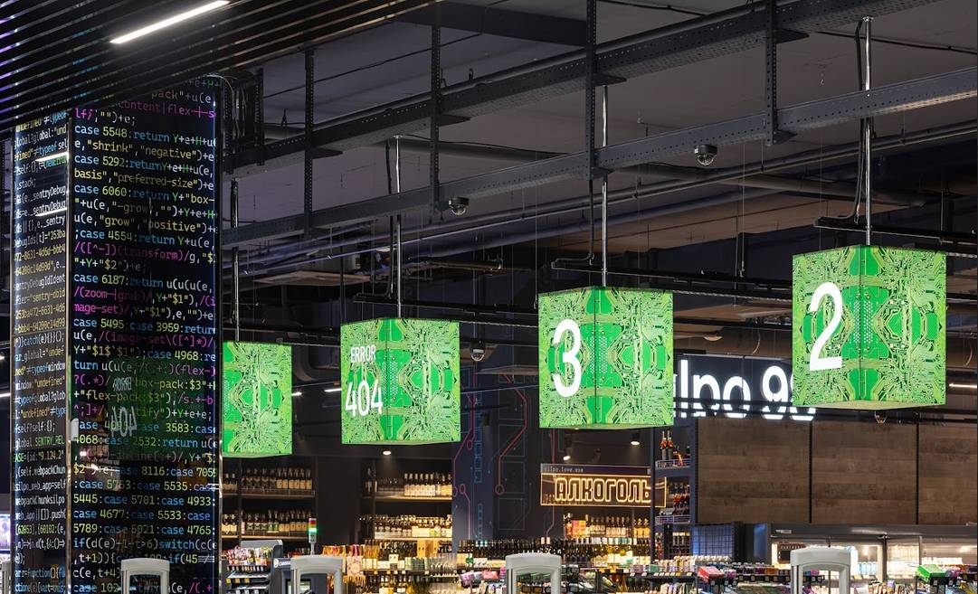 Серед елементів дизайну є вивіски у вигляді клавіш комп’ютерної клавіатури, касові зони у стилі мікросхем та програмний код із сайту «Сільпо» на колонах магазину.