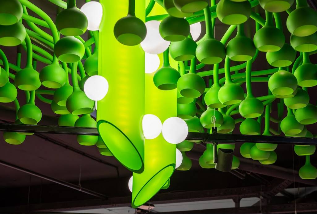 Замість вивісок – чашки Петрі, а у відділі овочів і фруктів є символ ДНК, що натякає на особливий смак кожного продукту. Алкогольний відділ оформлений як лабораторія з колбами.