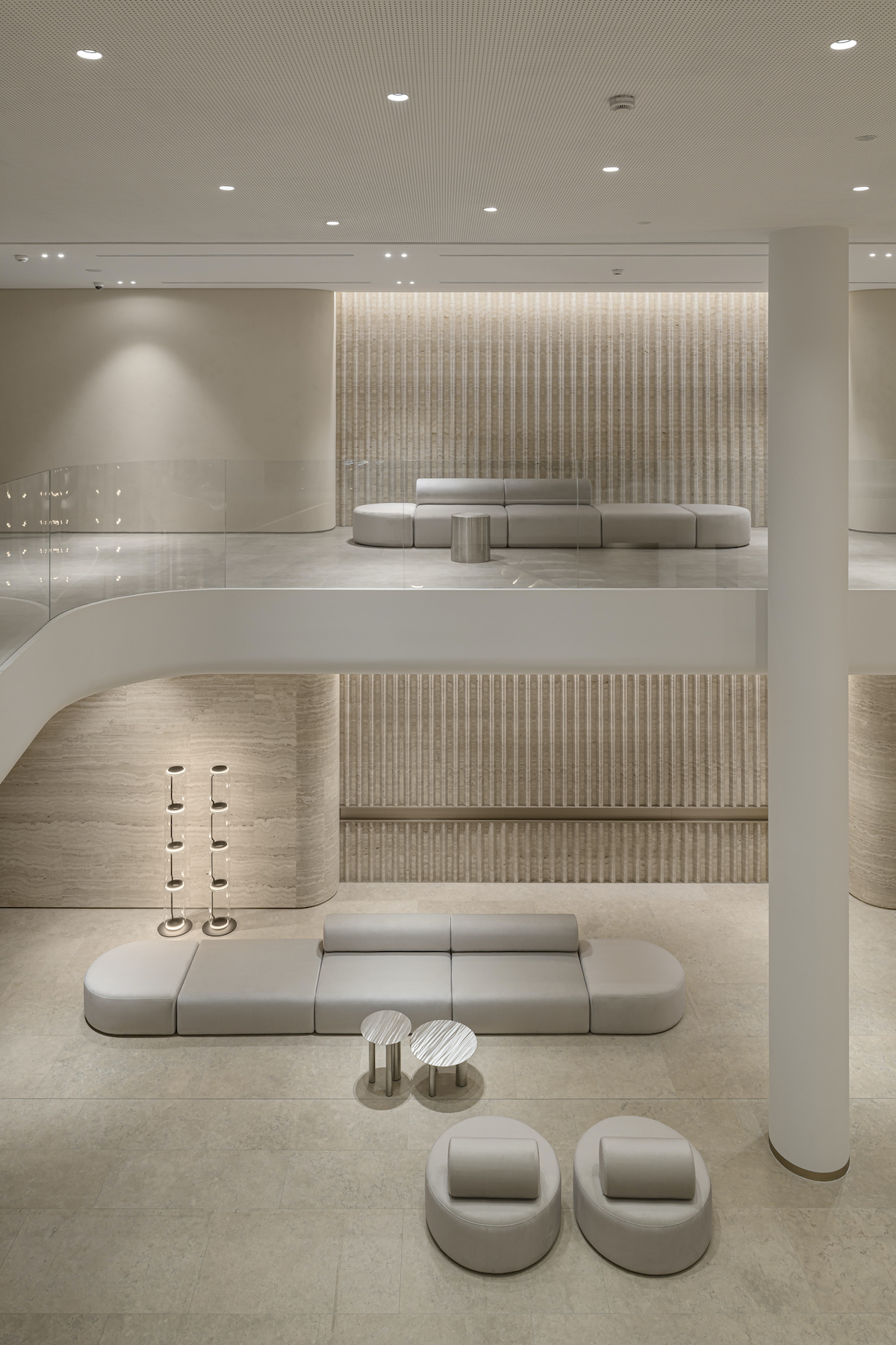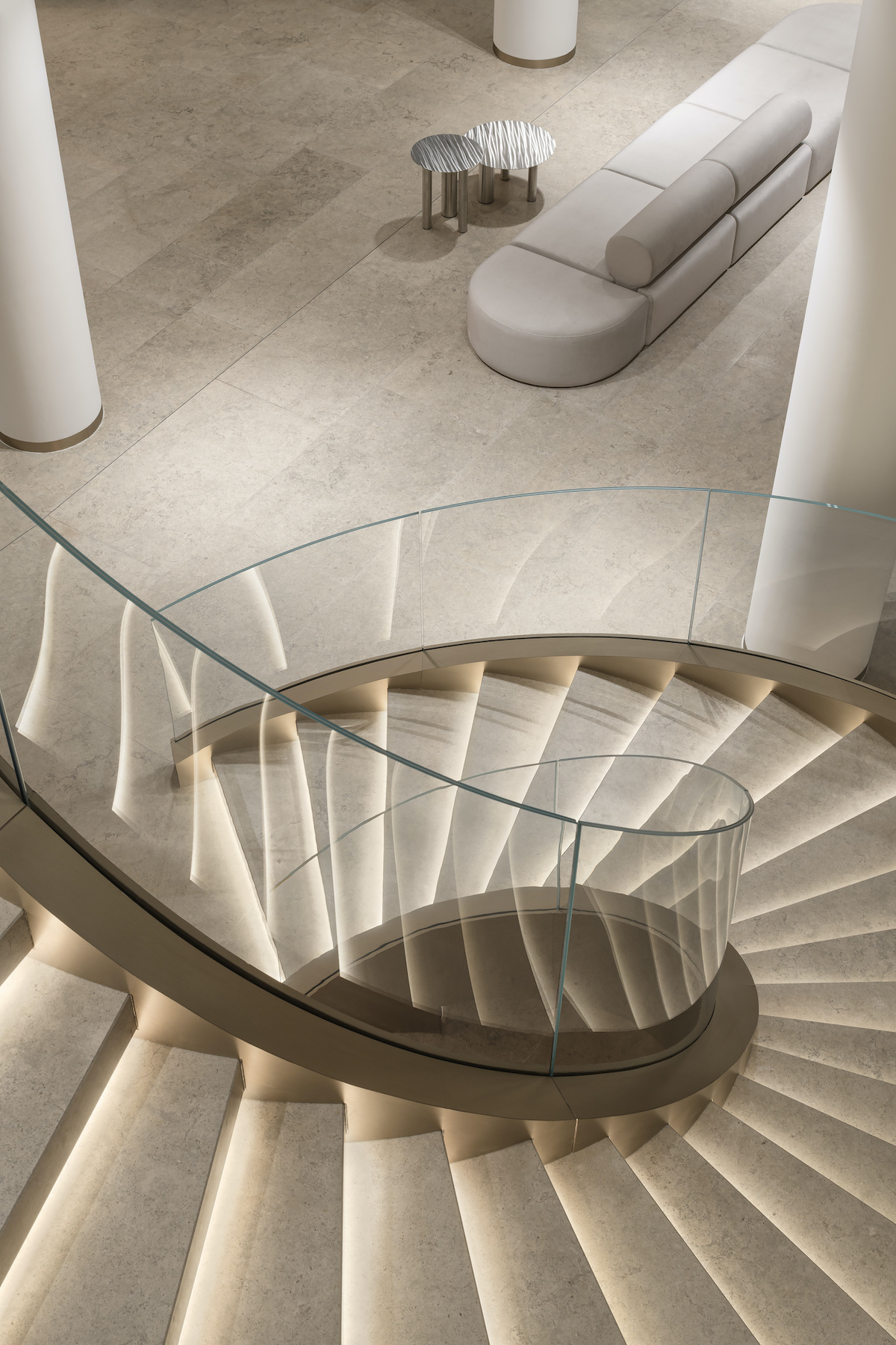 Вестибюль також оздоблено натуральним каменем. Тут є два центри тяжіння — монументальна 7,5-метрова стела та гвинтові сходи, які послучають головний хол із галереєю другого поверху.