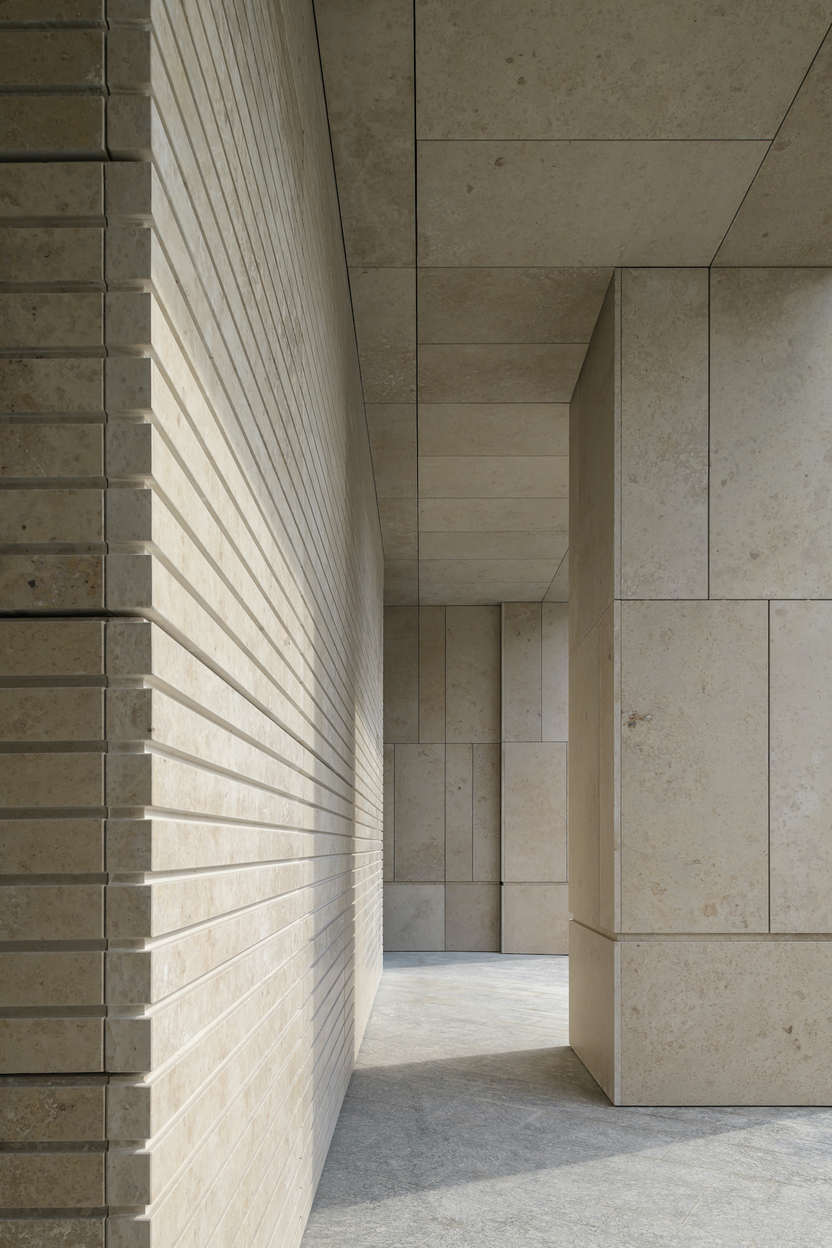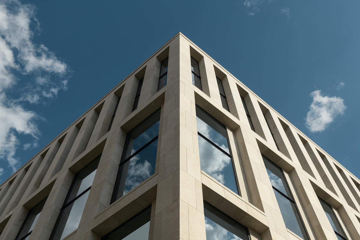 Фасад оздобили природним каменем юрського періоду — з баварських кар’єрів вапняку Зольнхофен, де нещодавно були знайдені рештки найбільшого у світі птеродактиля в світі.