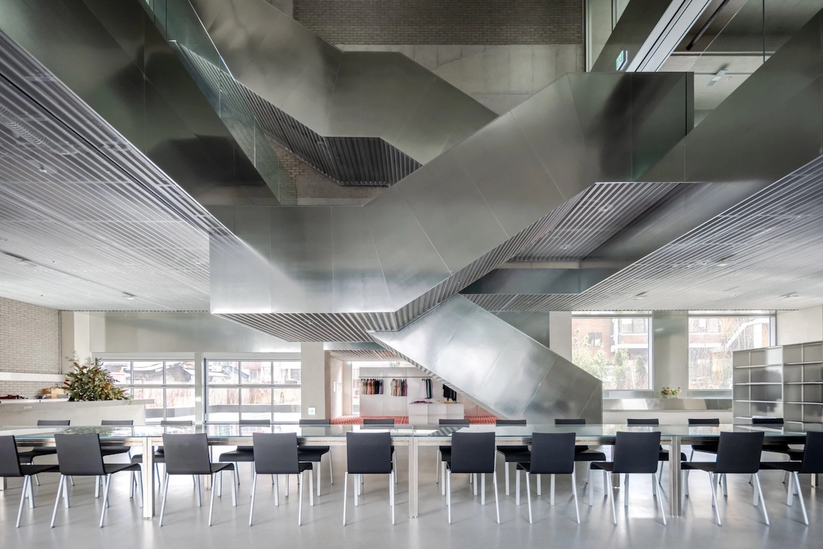 На перших трьох поверхах розміщено кафе, магазин, шоурум та майстерні, вище — офісні приміщення.
