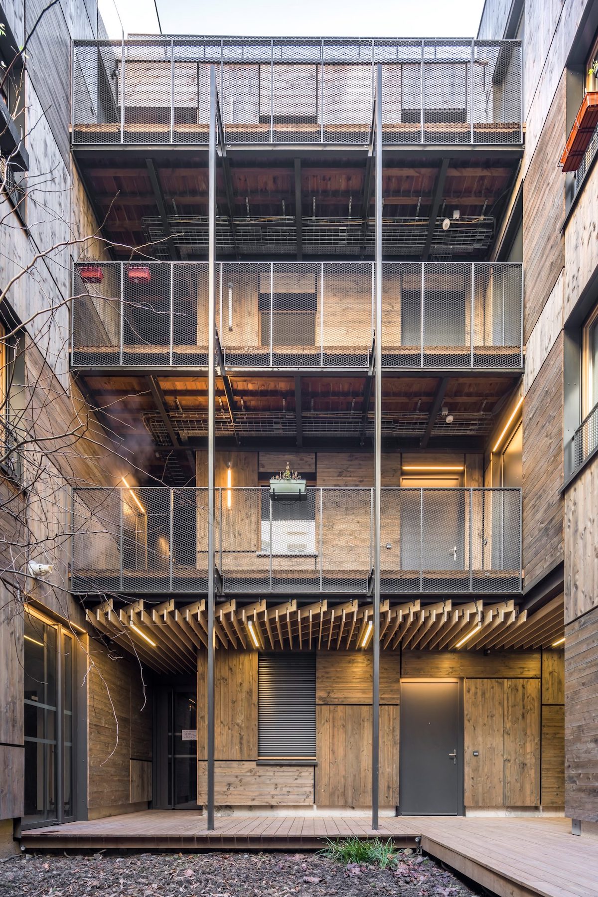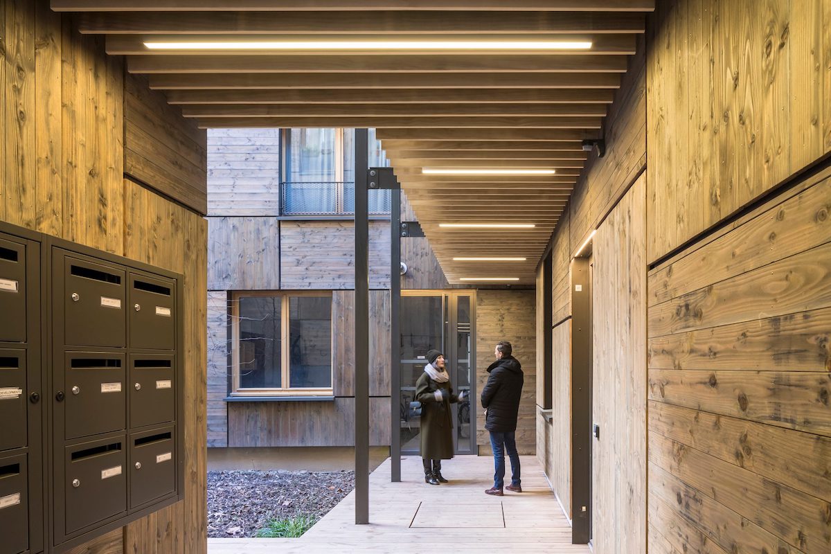 Вхід до квартир — через зовнішній коридор. В оздобленні також щедро використали місцеву французьку деревину та ОСБ-панелі.