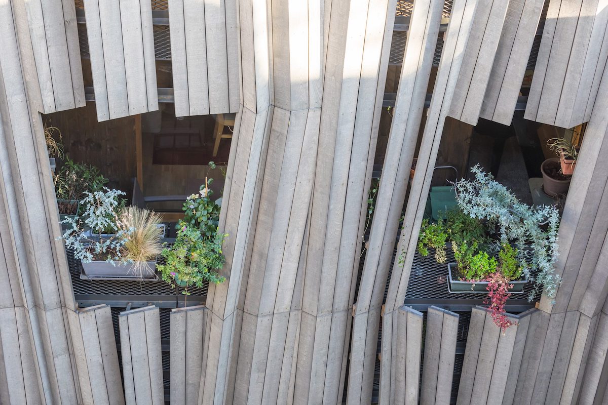 Фасад виконано з горіхових панелей, змонтованих під різними кутами.