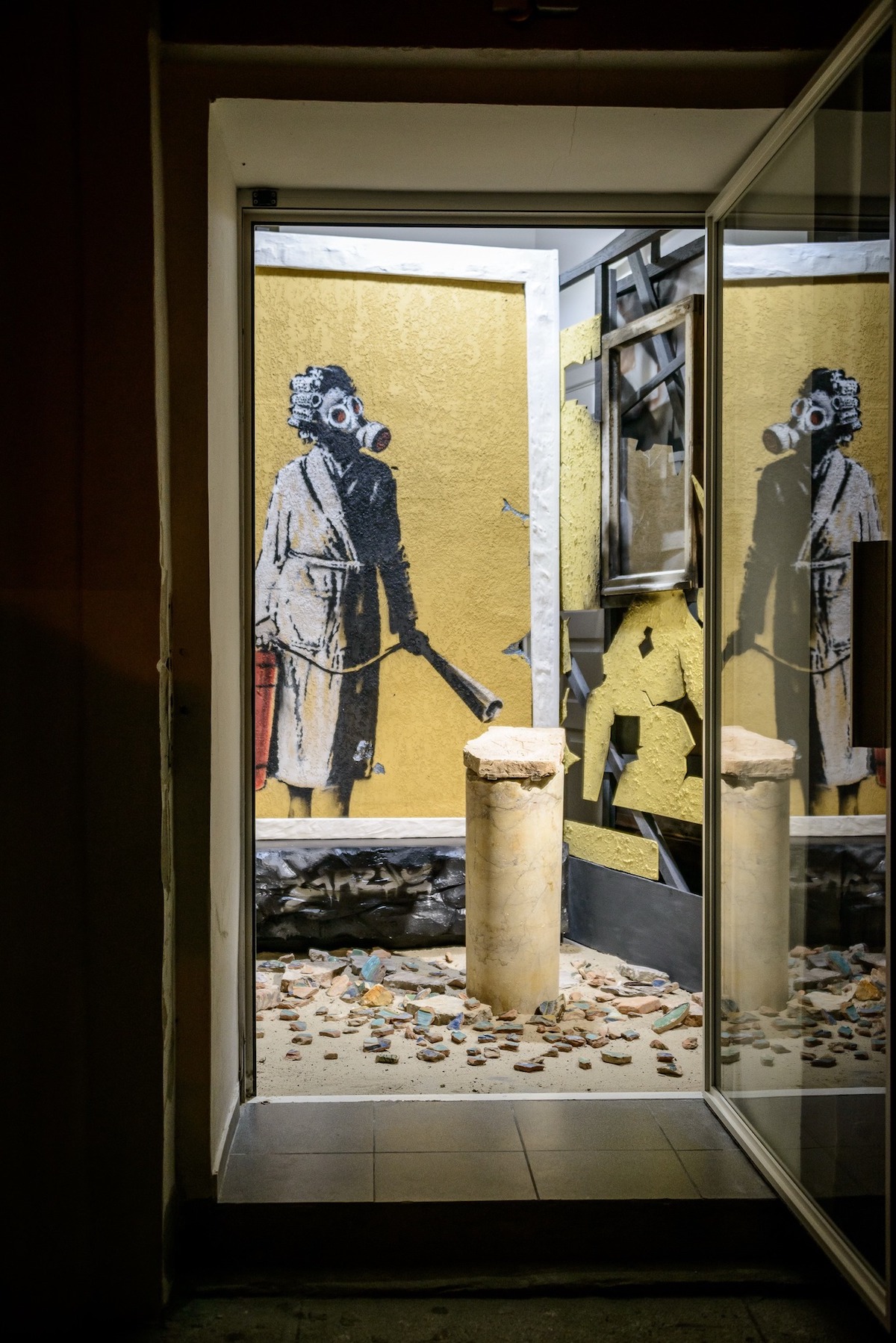 Цей мурал британський художник намалював на зруйнованому російськими ракетами будинку в Гостомелі, після деокупації Київщини в 2022 році. Зображення жінки у протигазі демонтував киянин Сергій Довгий, плануючи продати на аукціоні на користь ЗСУ. Його засудили на три роки умовно.