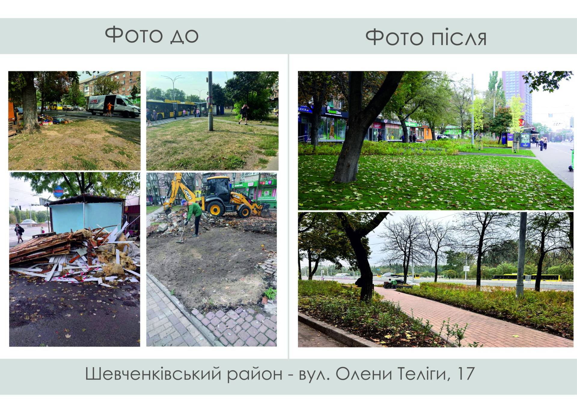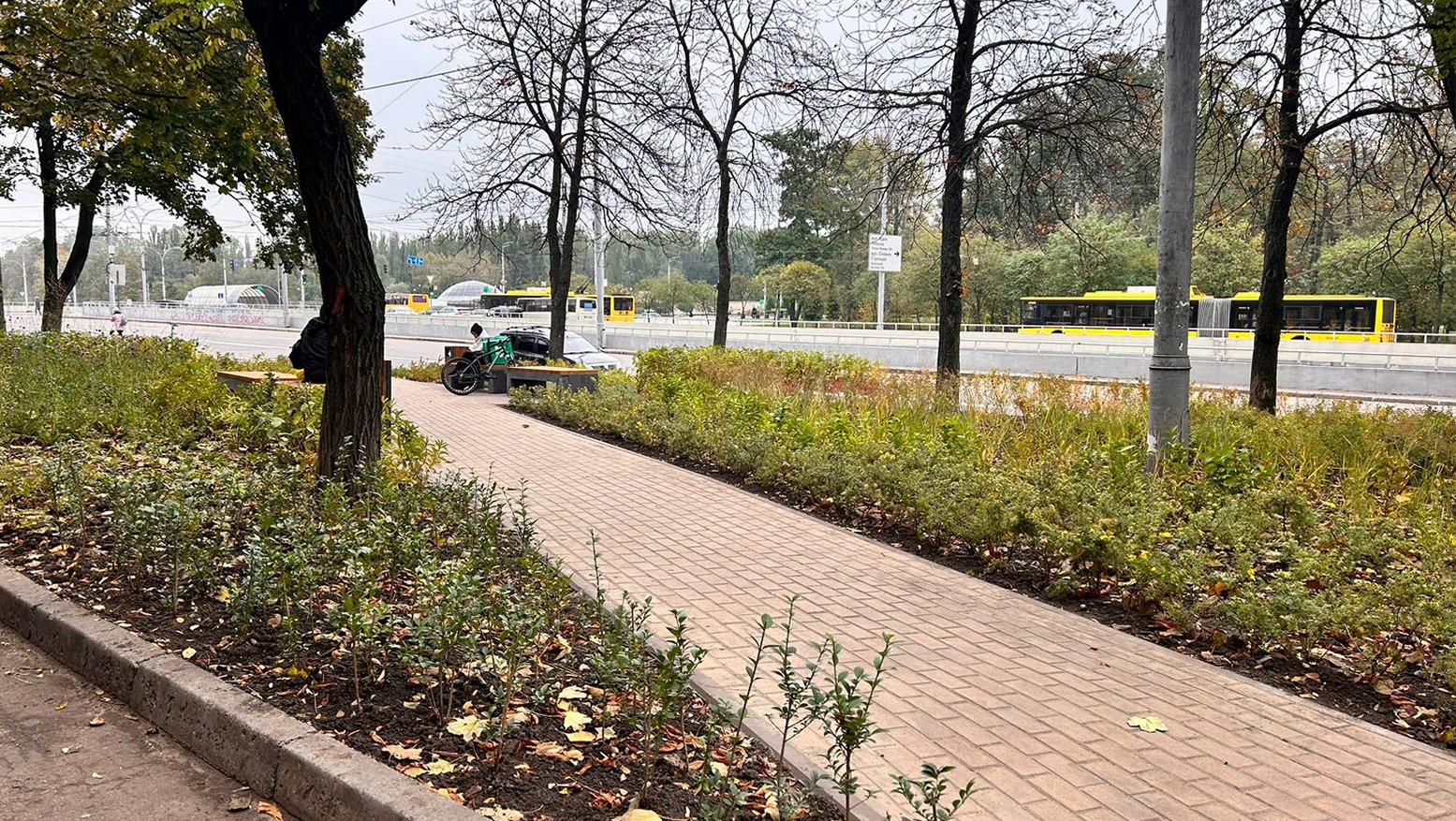 На вулиці Вишгородській у Подільському районі висадили 68 дерев, зокрема платани, і півтори тисячі кущів, а також лаванду, ехінацею, шавлію та злакові трави.