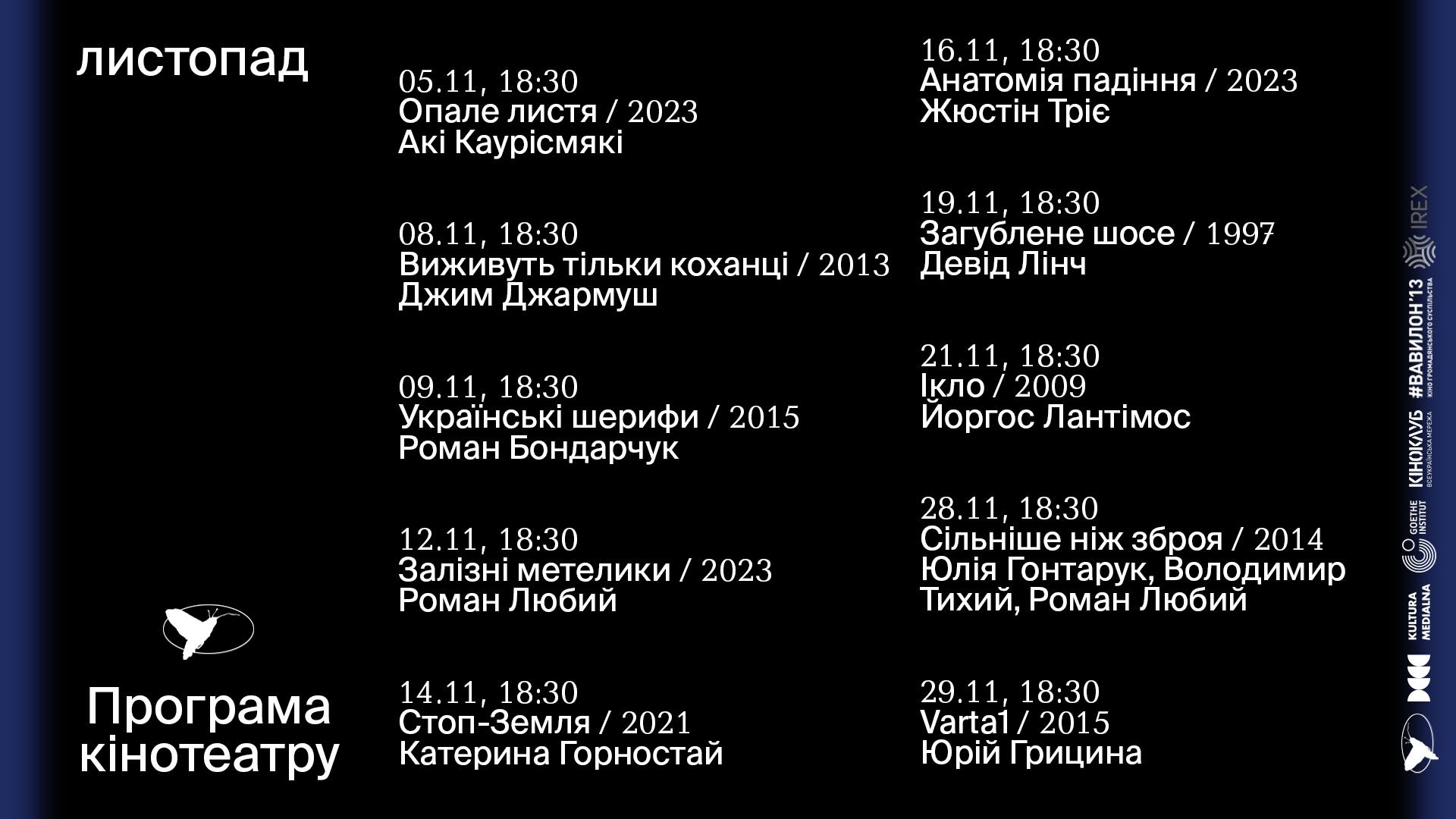 У листопаді показують фільми Акі Каурісмякі, Джима Джармуша, Романа Бондарчука, Катерини Горностай, Девіда Лінча, Йоргоса Лантімоса та інших.