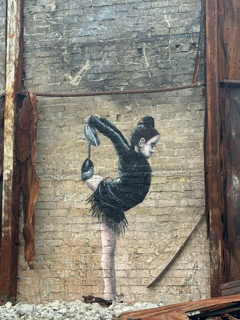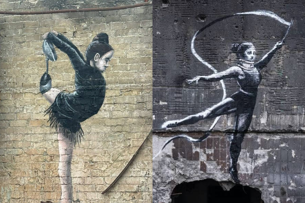 Стиль виконання та тема роботи нагадує роботи Бенксі на Київщині, зокрема зображення гімнастки в Ірпені.