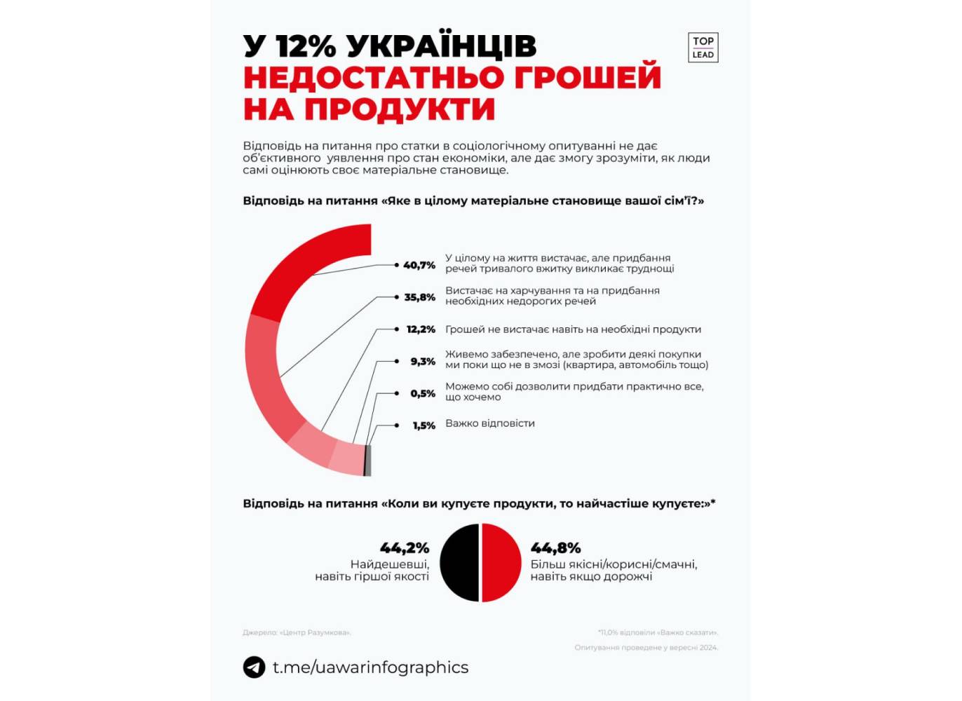 При цьому 12% українців мають недостатньо грошей на купівлю продуктів.