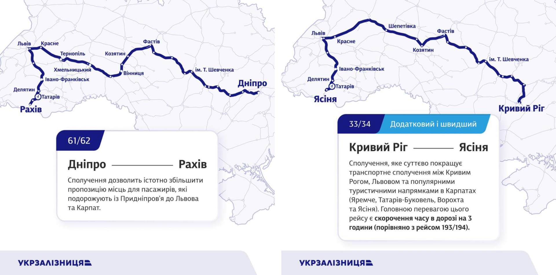 Поїзд №33/34 Кривий Ріг – Ясіня: забезпечує пряме сполучення між Кривим Рогом, Львовом та туристичними точками Карпат (Яремче, Буковель, Ворохта, Ясіня).