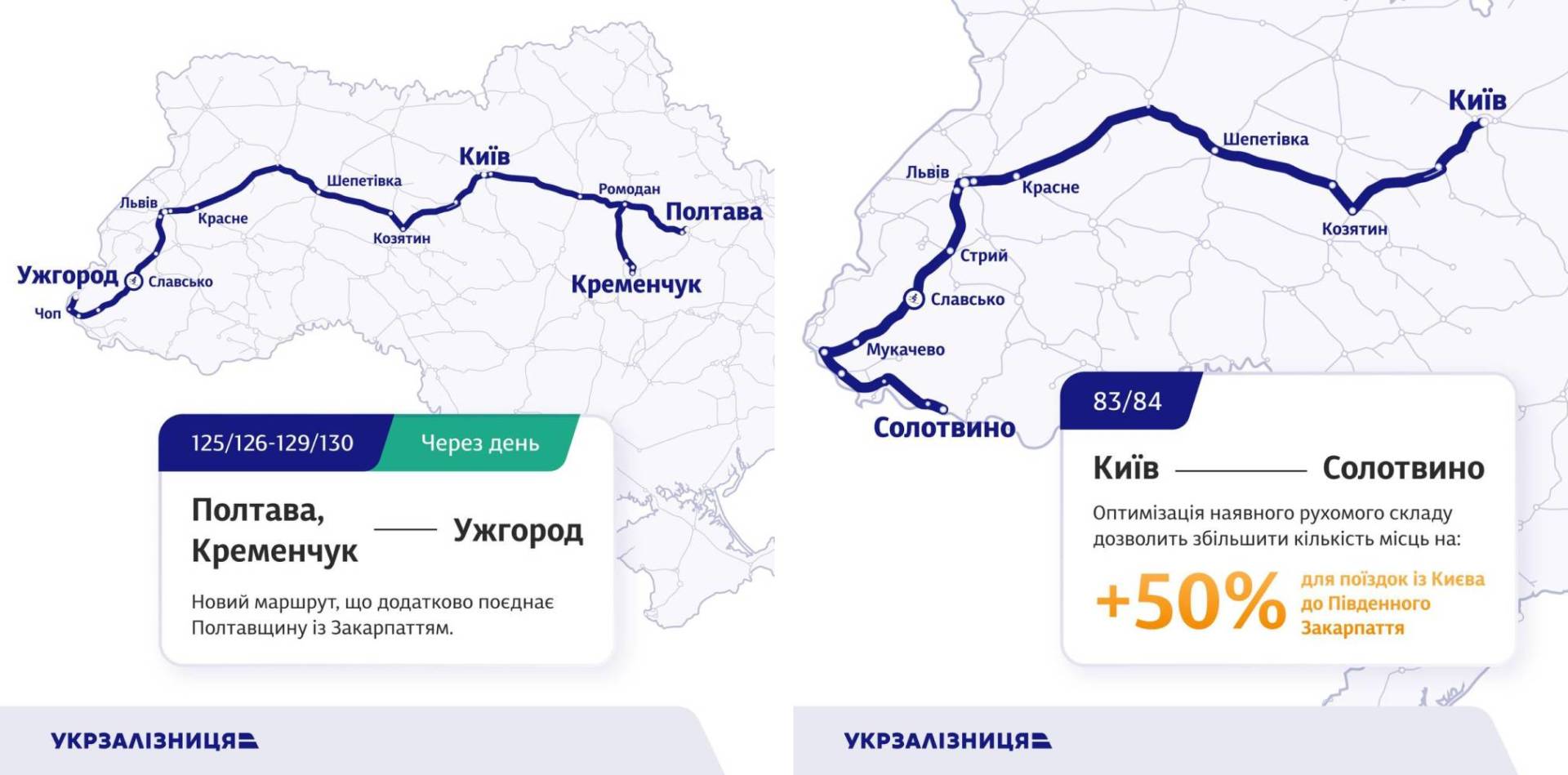 Поїзд №83/84 Київ – Солотвино (через день): на 50% збільшується кількість місць для подорожей до Славська та Закарпаття.