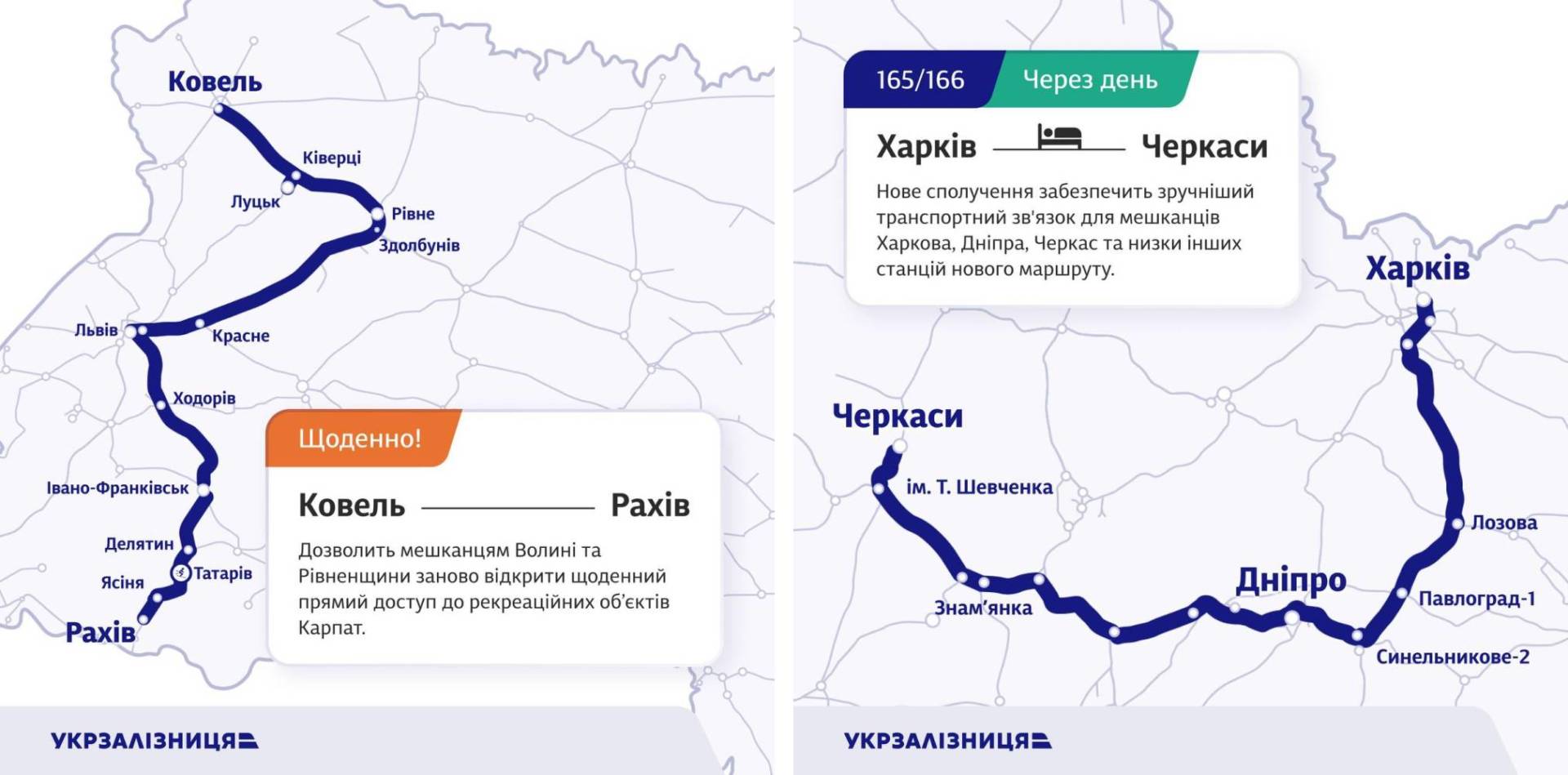Поїзд №61/62 Дніпро – Рахів (через день): додає більше місць для мандрівників із Придніпров’я до Львова та Карпат.
