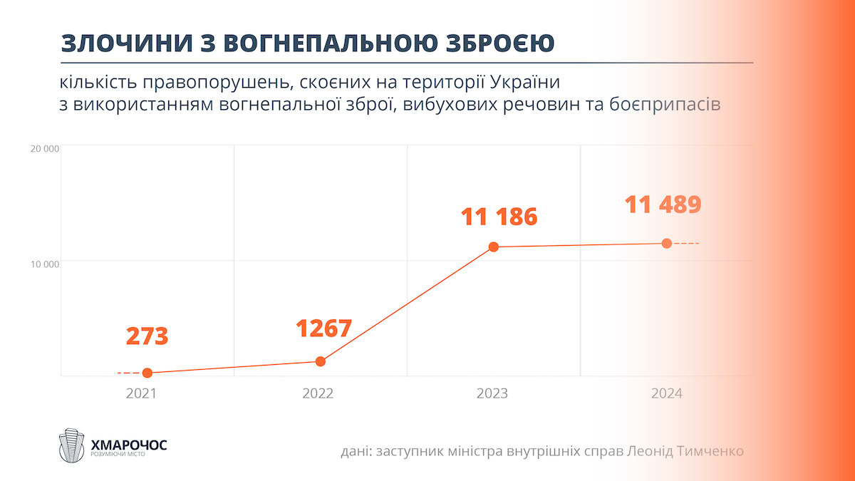 А за даними Офісу генерального прокурора, за неповний 2024 рік кількість всіх облікованих злочинів із використанням зброї та боєприпасів, які розслідуються правоохоронцями, становить 14,8 тисячі.