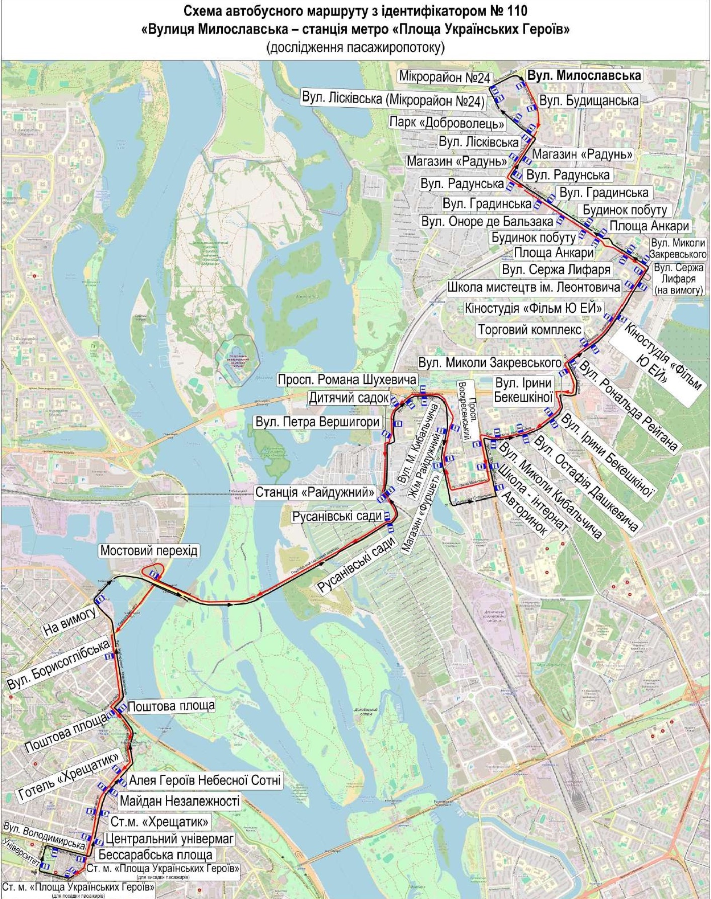 Автобус №110 курсуватиме від вулиці Милославської до станції метро «Площа Українських Героїв». Цей маршрут повністю дублює схему руху автобусу №61, тож роботу останнього буде призупинено.