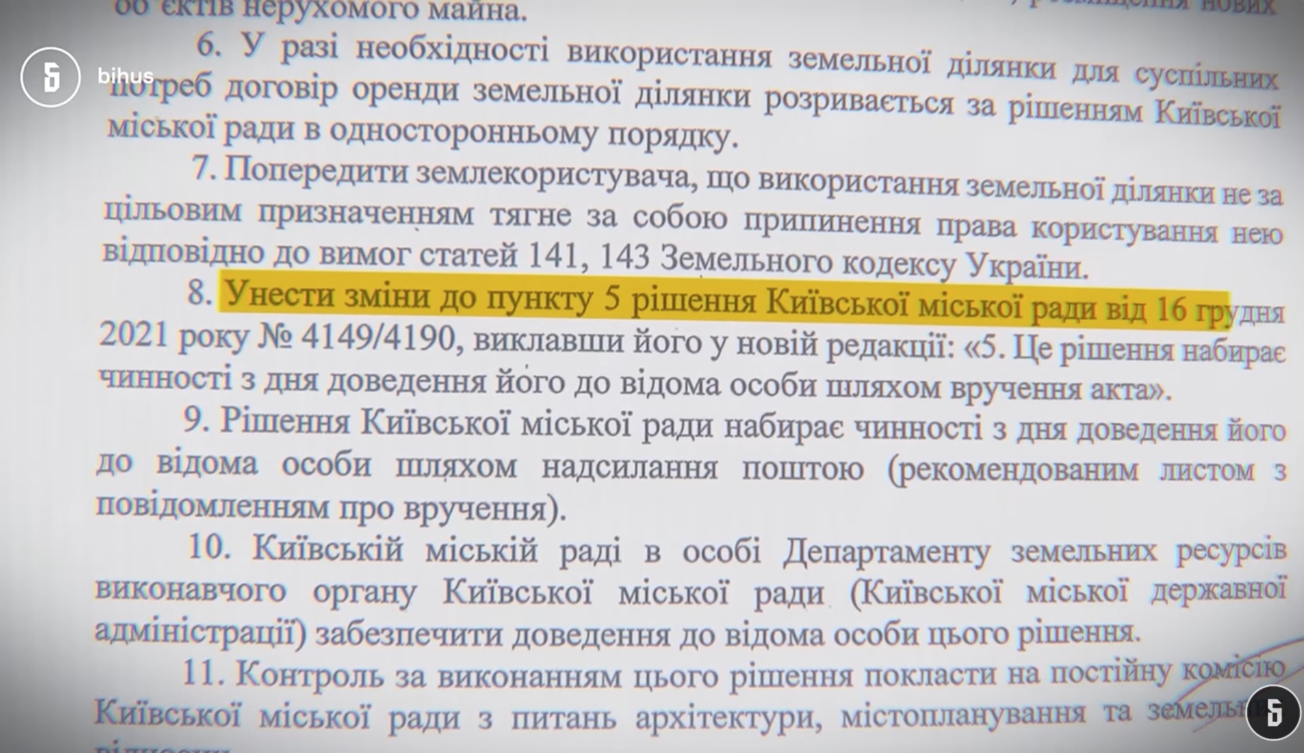 Однак напередодні голосування секретар Київради Володимир Бондаренко додав у текст рішення ще один пункт. Це один рядок, з якого відразу не зрозуміло, про що йдеться, — «…внести зміни до пункту п’ятого рішення Київської міської ради від 16 грудня 2021 року…».