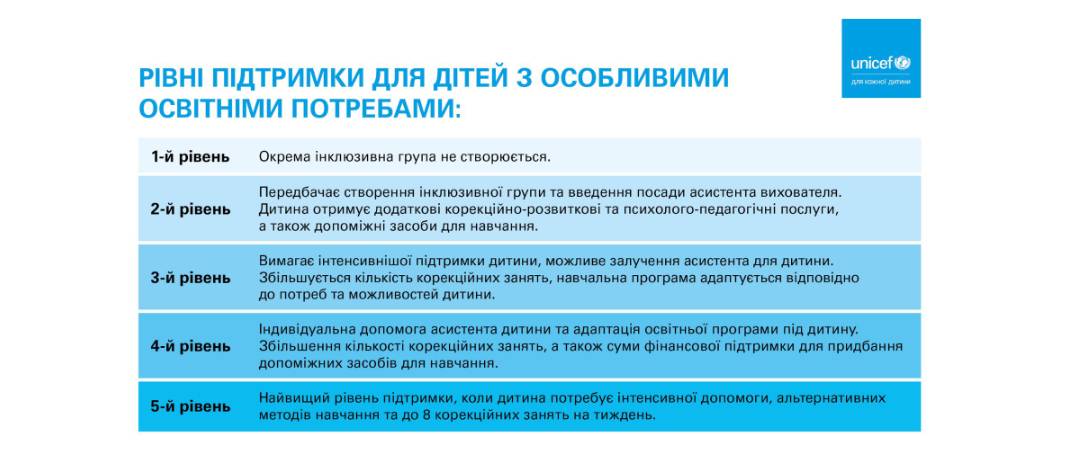 Також ЮНІСЕФ зазначає, що рівень підтримки дитини визначає інклюзивний центр і в Україні існують наступні рівні: