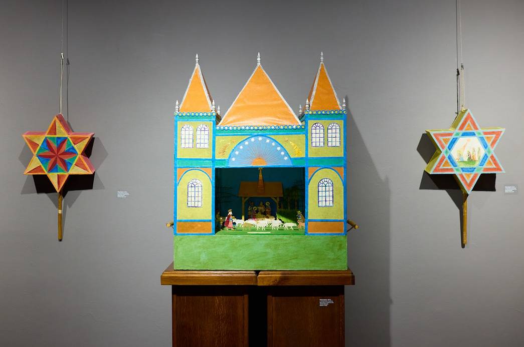 Експозиція включає автентичні твори з колекції Національного музею народної архітектури та побуту України, зокрема народні ікони XVII–XIX ст., свічники, косівську кераміку та різдвяні зірки. Також на виставці представлені роботи таких митців, як Тарас Данилич, Федір Манайло, Іван Марчук та Володимир Микита.