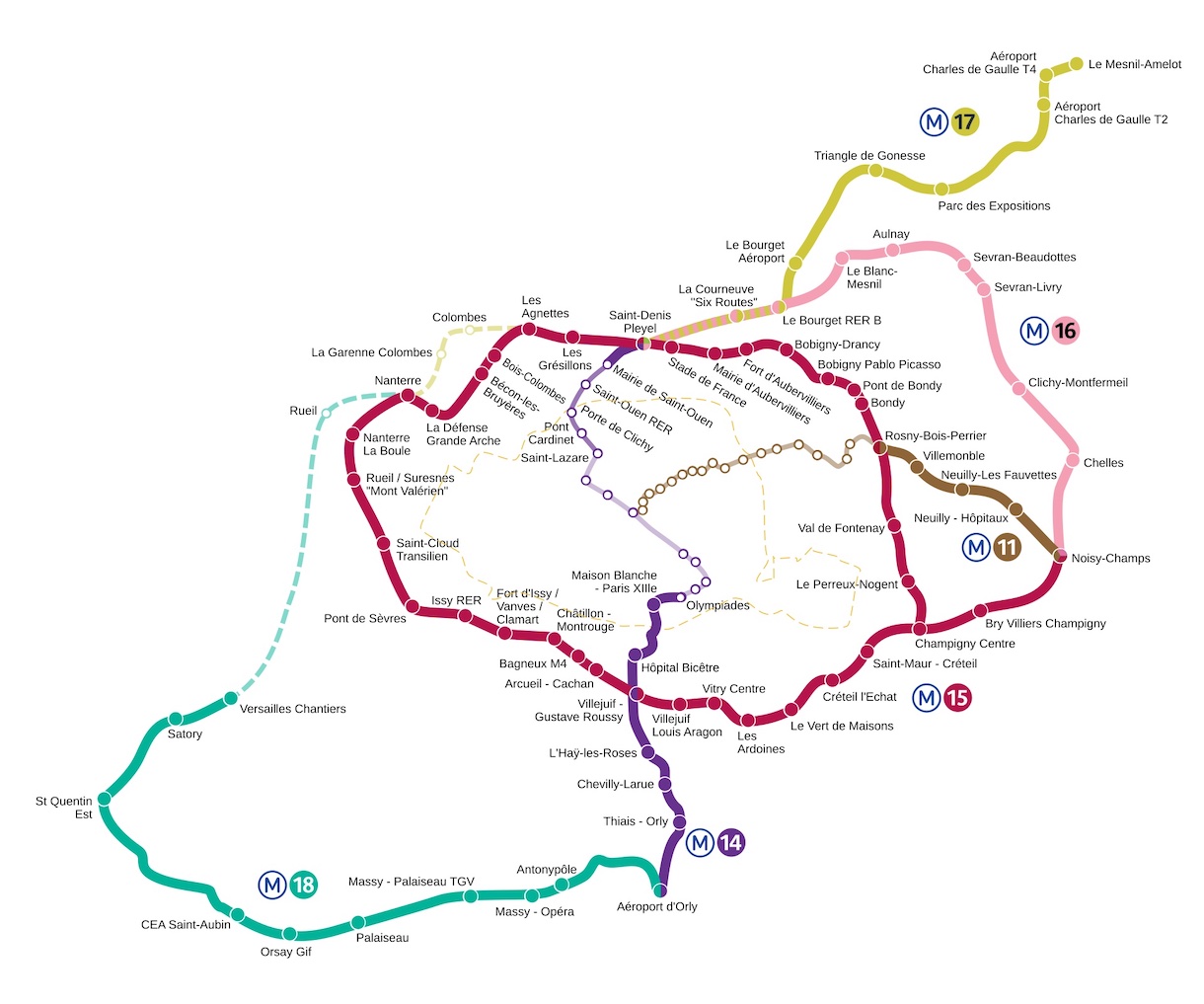 Столиця Франції створює нову систему метрополітену — проєкт Grand Paris Express, що передбачає будівництво чотирьох нових ліній і продовження двох наявних. Загалом це 200 кілометрів нових колій і 68 нових станцій.