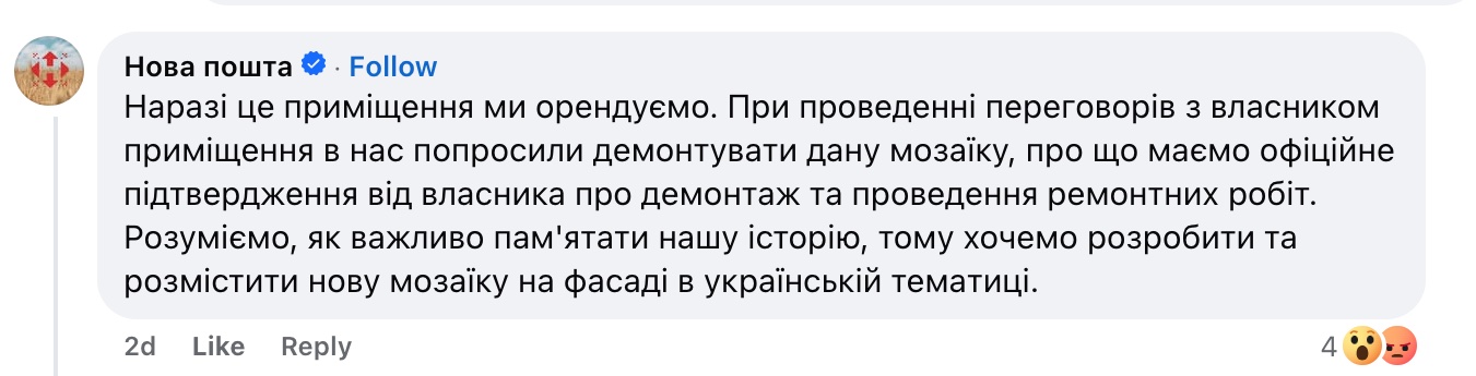 При цьому Нова пошта заявила, що натомість створить і розмістить на фасаді нову мозаїку в українській тематиці, розуміючи, «як важливо пам’ятати нашу історію».