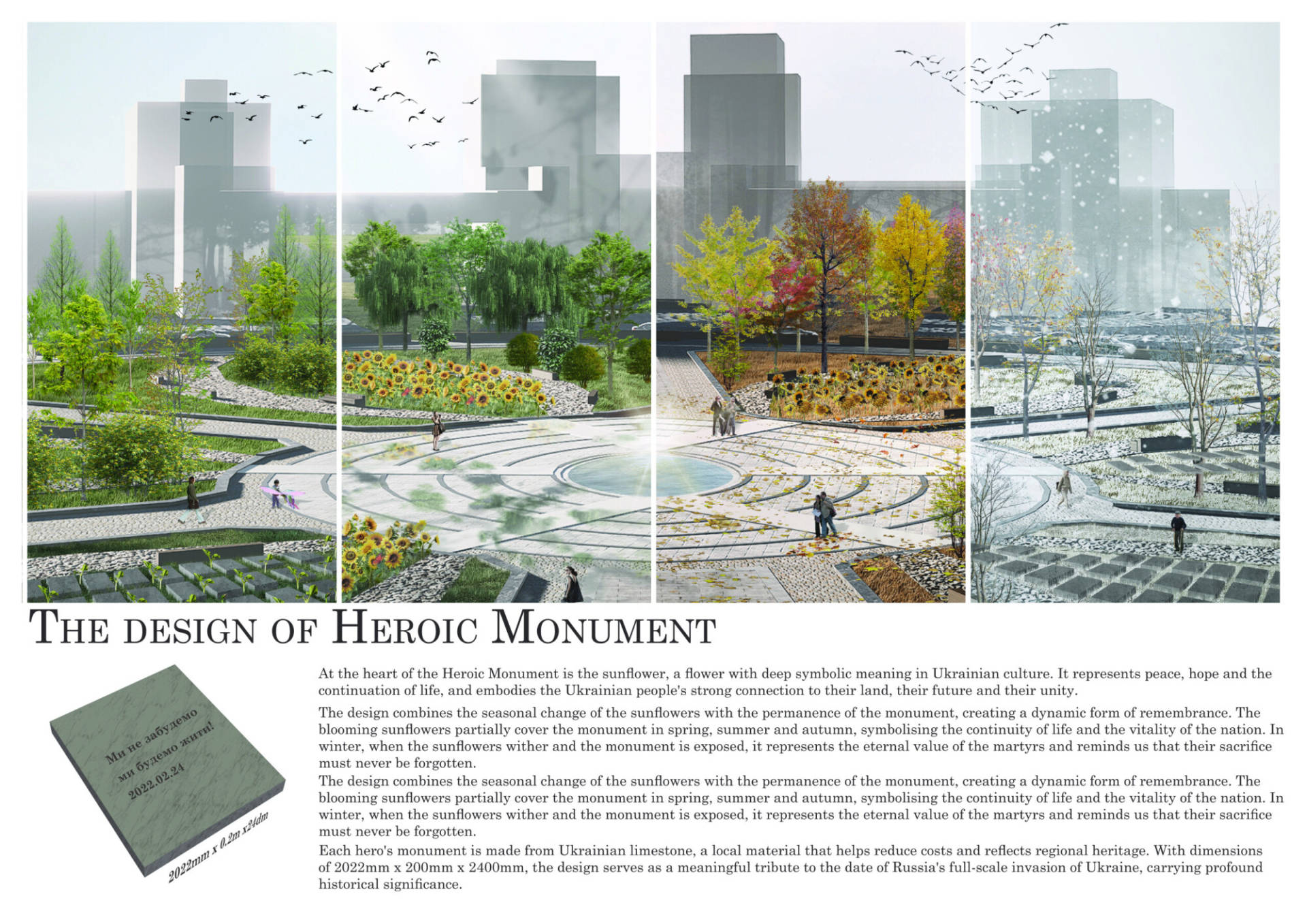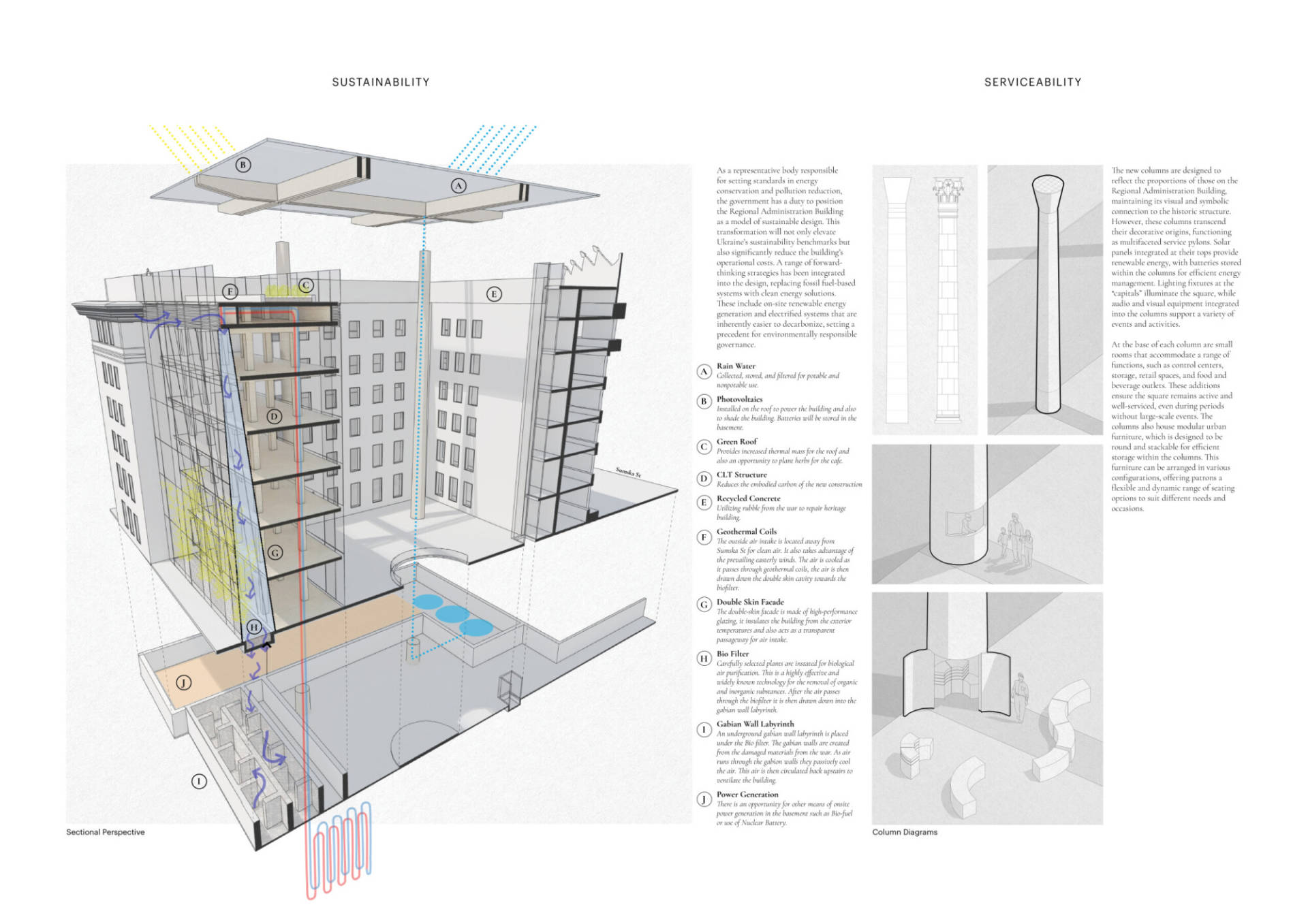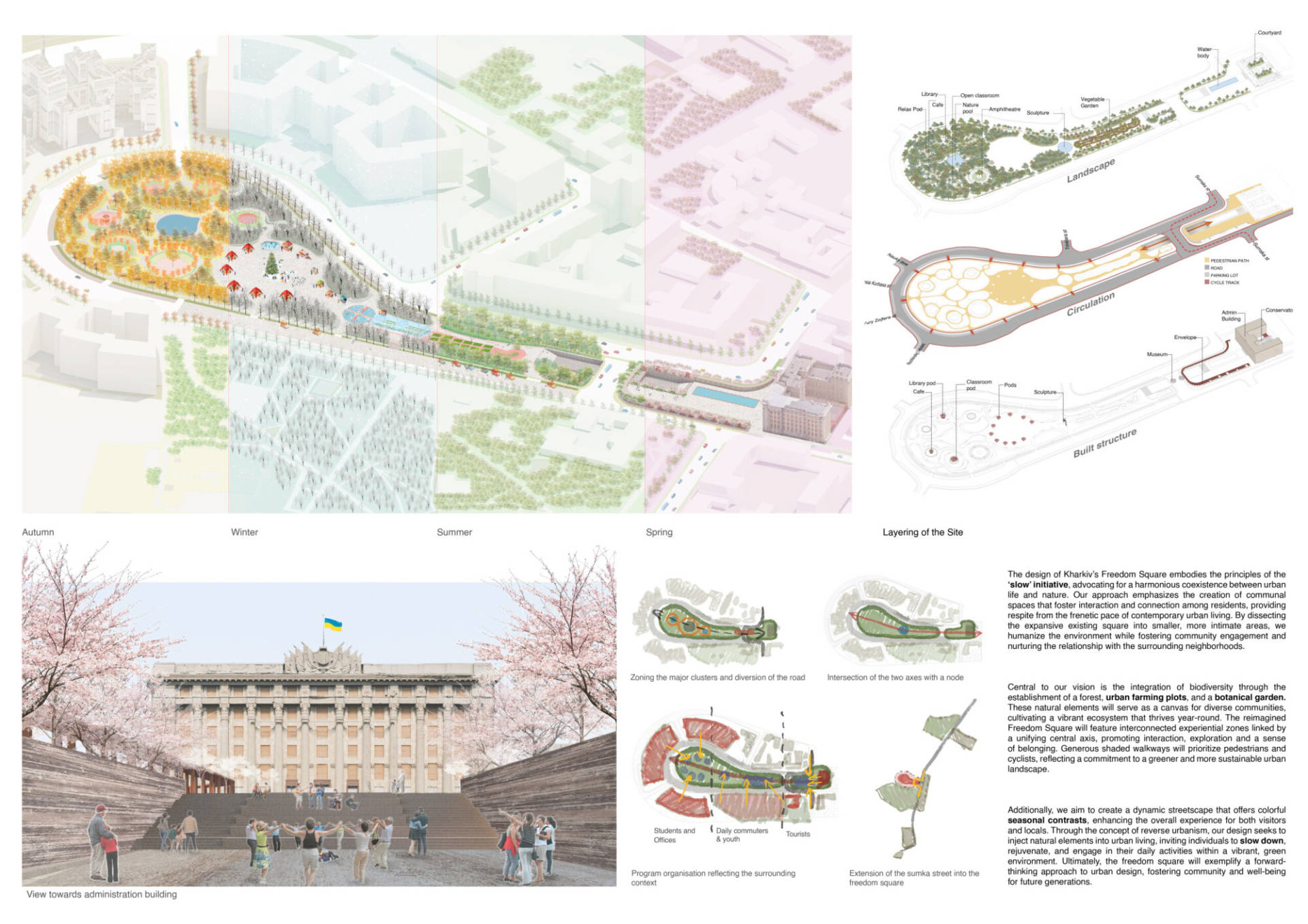 Британський студентський проєкт пропонує оточити площу Свободи зеленими зонами з продуманими елементами, які покращують функціональність, зберігаючи її величність. Відновлений фасад будівлі Харківської ОДА гармонійно поєднується із громадським простором, створюючи баланс між історичною спадщиною та сучасними прагненнями.