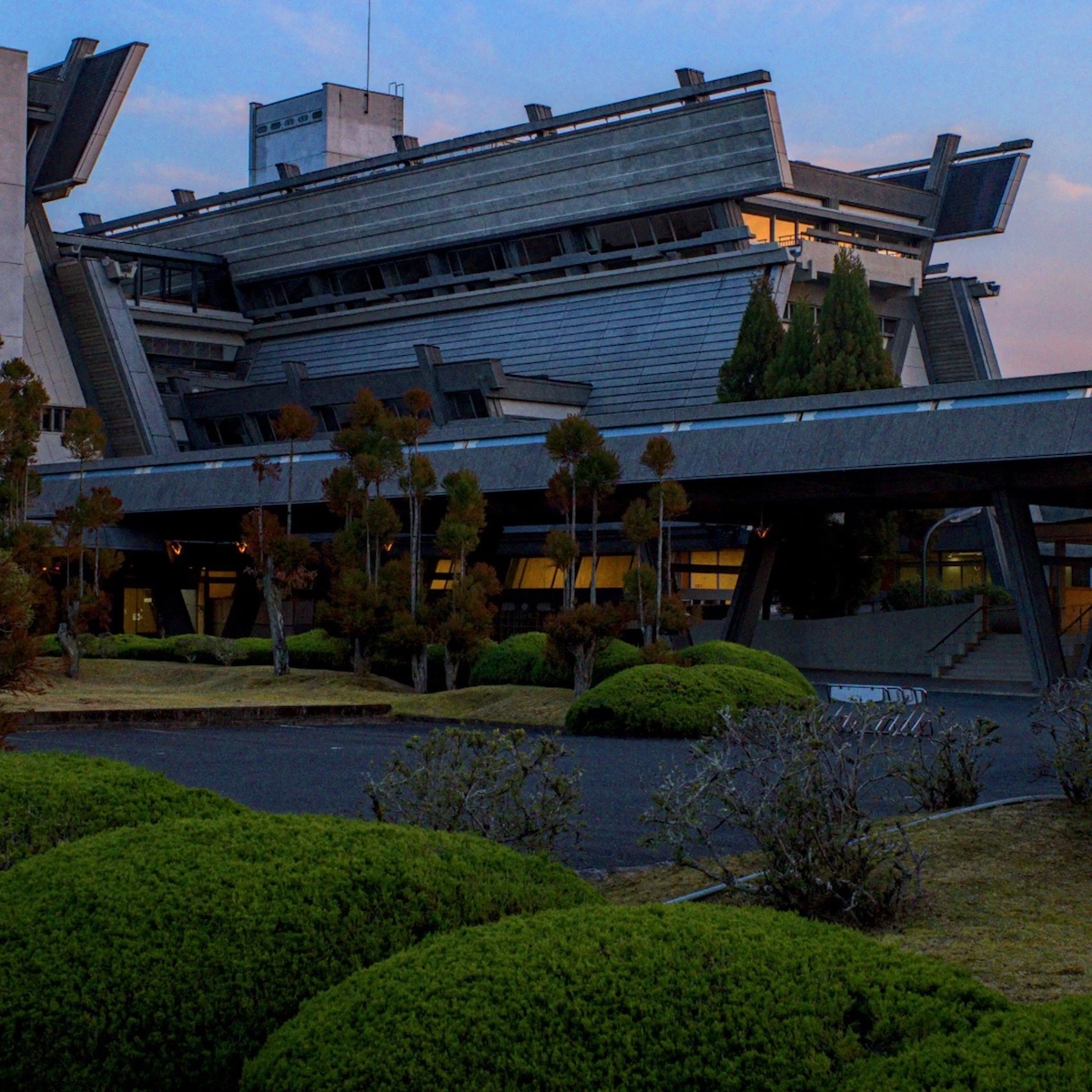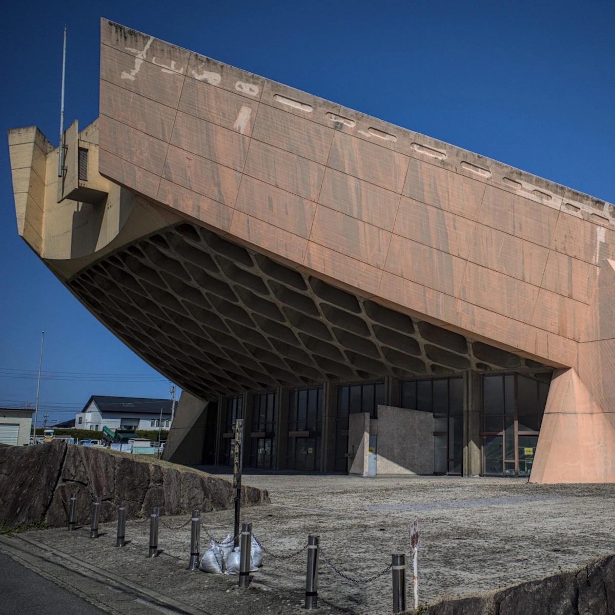 Бетонну конструкцію, що обрисами нагадує традиційні японські дерев’яні човни, підтримують чотири масивні опори. Зараз пам’ятка перебуває під загрозою знесення: спортзал закрили через протікання даху. При цьому незвичний дизайн робить реконструкцію заскладною.
